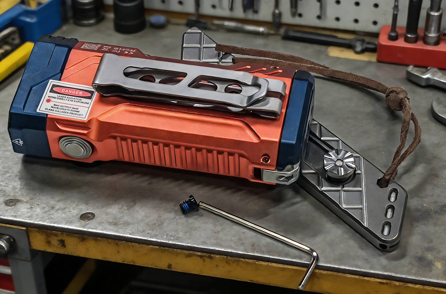 E28的反面使用两颗六角螺丝固定一枚不锈钢双向背夹,金属原色与开关、电池仓解锁扭相呼应,宽大的背夹弹性和韧性都很好,可以将E28挂在背包、口袋、腰带等位置,筒不离身、随手就用。