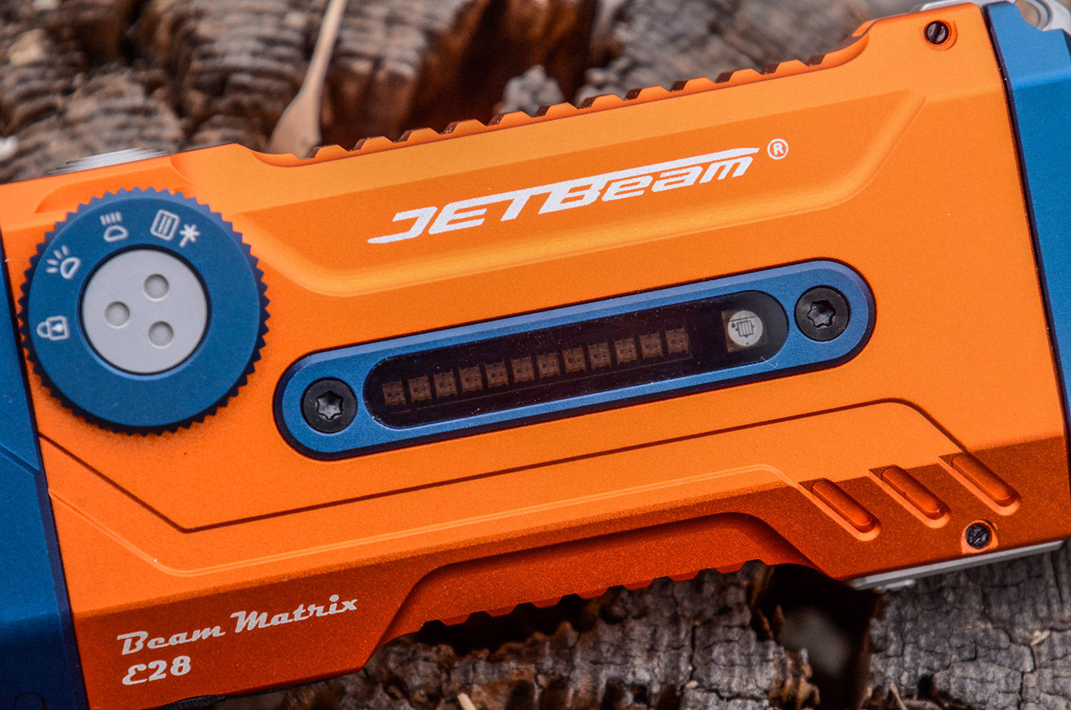 灯头是手电的门面,JETBeam E28的主灯采用双灯珠并列布局,严格对称设计,泛光为7070规格大面积LED,最高光通量3300lm,远光采用SFT-42R灯珠,最高光通量约2500lm,双灯一大一小,格外醒目。