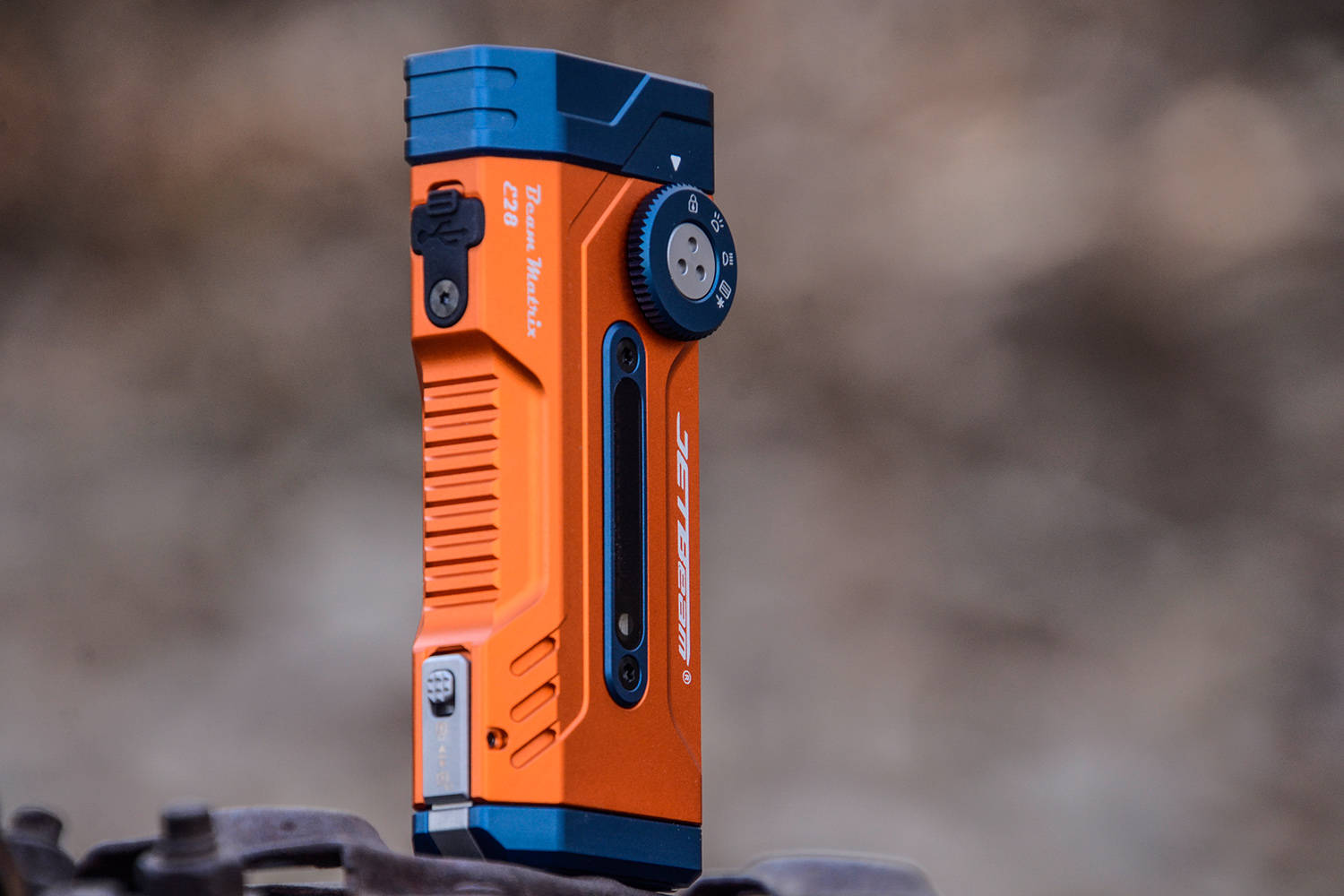 E28与尾部开盖同侧,灯头位置设计了USB-C通用充电口,并且有单颗螺丝固定的防水胶帽,起到防尘防水防杂物的效果,日常可以放心使用。