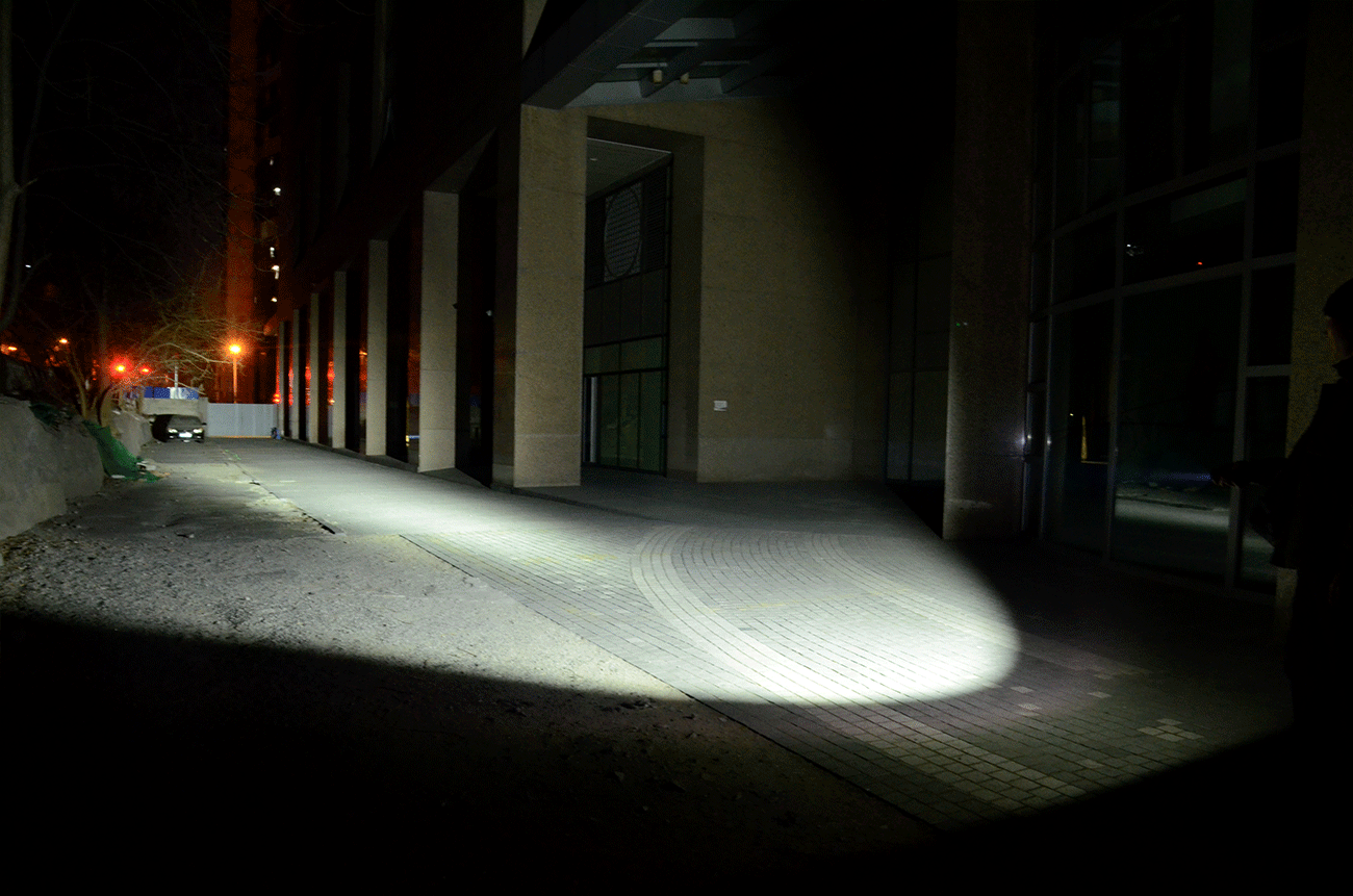 从光线效果,可以清晰分辨出两颗灯珠的不同效果,聚光形成的主光斑张角约为5°,泛光区的角度约为80°;泛光的角度能够达到约120°,而且照明区域内亮度均匀,在地面形成了大范围的照明面积,这就是远泛兼顾的照明表现。