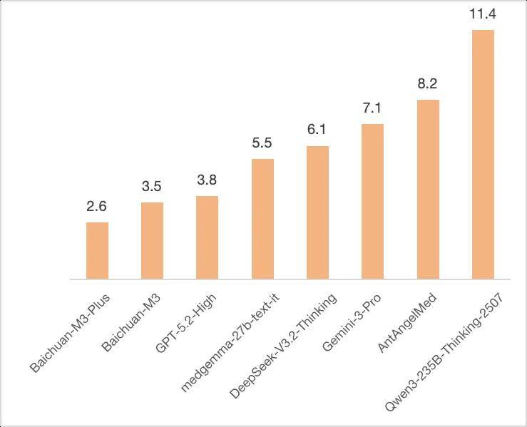 M3 Plus 模型在 Halluciation Rate 评测中的幻觉率只有 2.6,比 GPT-5.2 低超过 30%,也低于目前行业的标杆 Open Evidence,刷新了医疗模型低幻觉世界纪录。