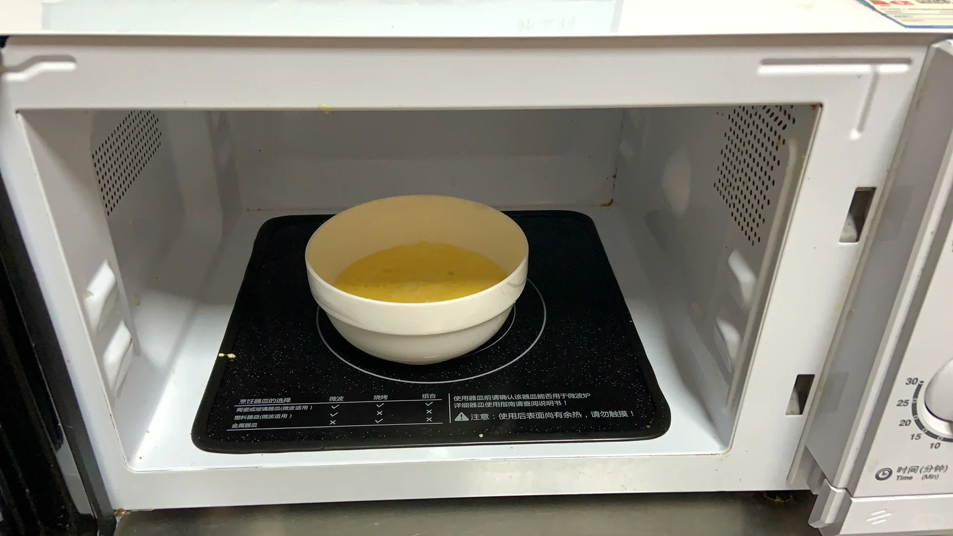 鸡蛋搅匀加开水,比例是1:1,然后去掉表面的浮沫,盖上保鲜膜,在上面扎几个孔,然后放进微波炉里,小火5分钟,时间不要太长,如果火候不够,可以再多打一两分钟。
