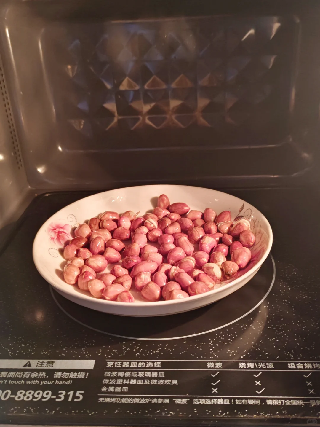 然后加入少许食用油拌匀,把花生米平铺在盘子当中,放入微波炉,高火4分钟,中途两分钟可以翻个面。时间到了取出来,等到放凉了之后就会变脆。