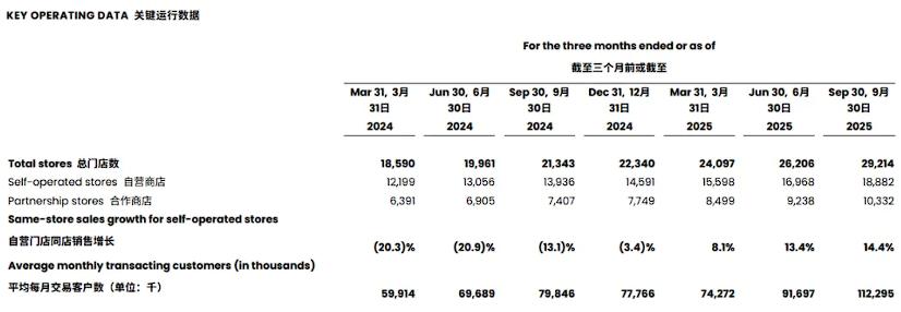 自营门店同店销售连续三个季度保持双位数增长,Q3增速达14.4%,证明其单店模型在精细化运营下的持续优化能力。