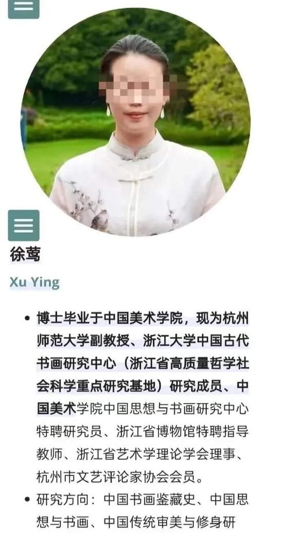 徐莺现在是某大学音乐学院的副教授,大学官网介绍她是博士毕业于中国美术学院,还是某大学中国古代书画中心研究员,看似是收藏领域和美术专业的专家。