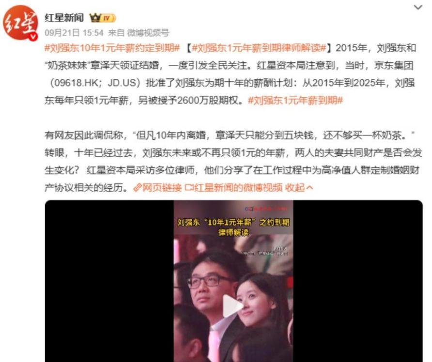 2015年,她和刘强东结婚时,身上贴的标签是"傍大款"、"麻雀变凤凰"。但刘强东的一个决定,却让她成了众人眼中的"可怜人"。在他们结婚前一天,京东公布了一项让人震惊的薪酬计划:未来十年,他所有的婚前财产一年只有1块钱,如果离婚,女方能分到的财产连杯奶茶都买不起。