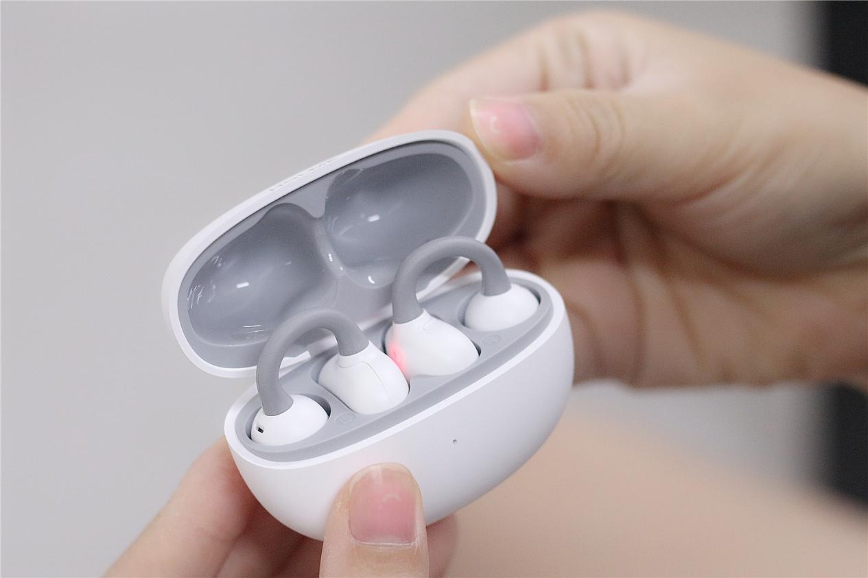 耳夹式设计可以让耳朵可以保持通透,不会有闷得慌的感觉;重量上,耳机单耳约 6.3 克重,戴在耳朵上负担很轻,即便长时间使用,也不会有沉重感或酸痛感。加上“C 型” 内桥外部用了高品质 TPU 材质,触感柔软亲肤,戴久了也不会硌耳;而且还有 12° 黄金夹角设计,既能牢牢贴合耳部,又能保证舒服度,佩戴体验特别好。