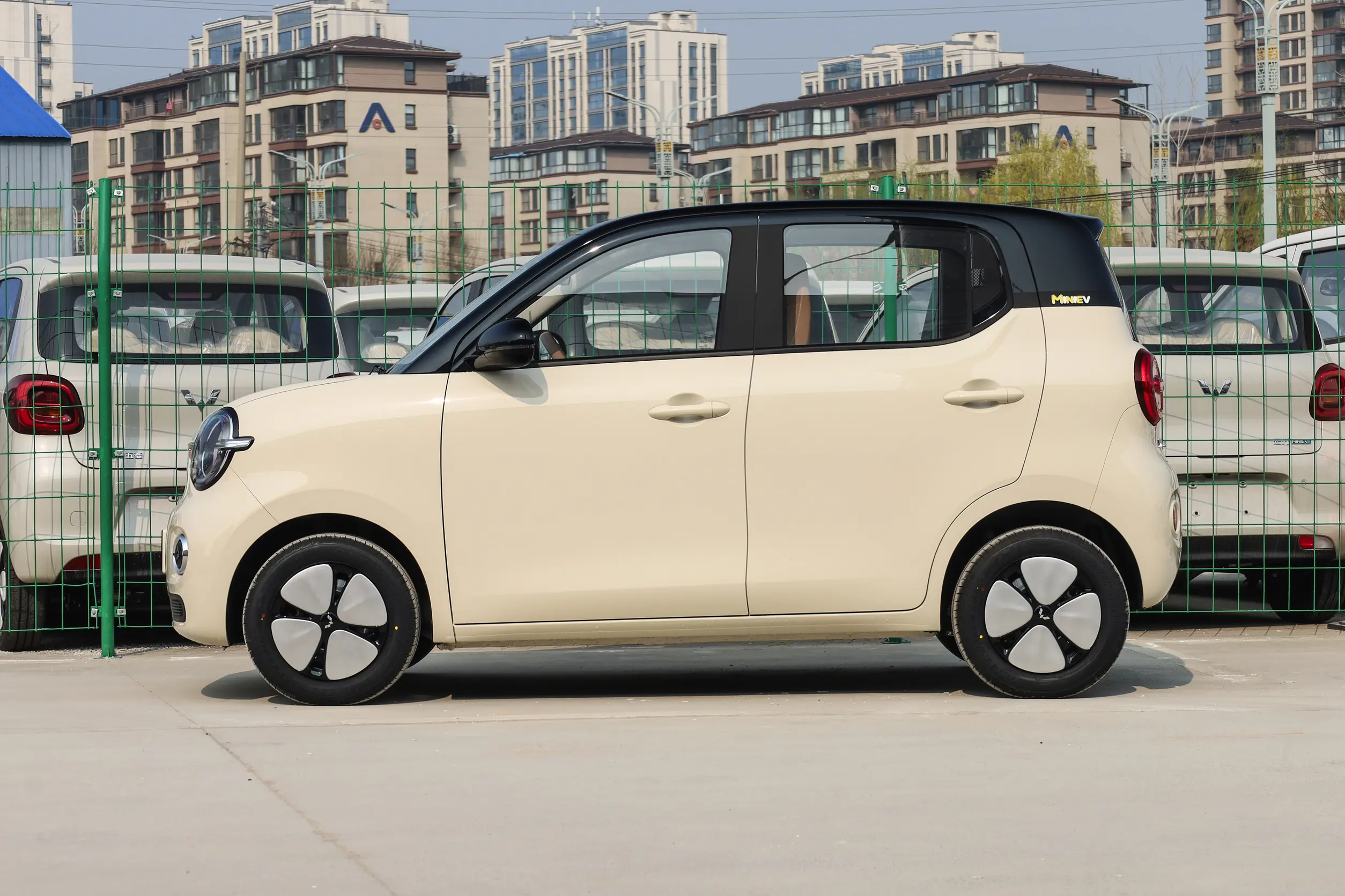 前脸部分,闭合式前格栅搭配星环LED大灯组更显可爱,车头中央布置有充电接口,并且在保险杠区域增加“向日葵酒窝”装饰组件,贯穿车头的镀铬饰条提升了精致度。第五代五菱宏光MINIEV依旧提供四门版车型,车身侧面曲线流畅,保留简洁实用的实体车门拉手,搭配撞色车身和四叶草造型轮毂,细节设计年轻可爱。