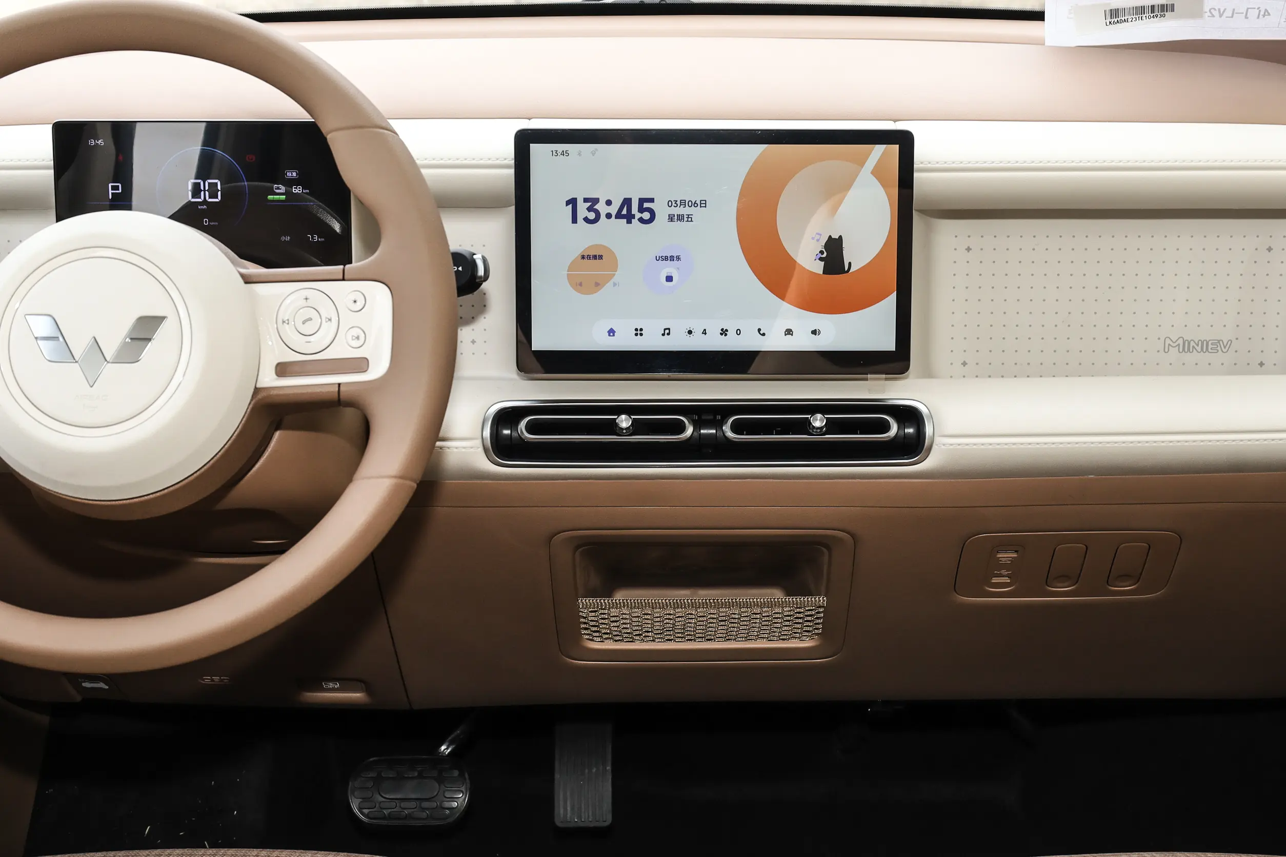 内饰方面,第五代宏光MINIEV的精致度和实用性有了较明显的升级,延续了焦糖奶油风的内饰风格,采用电子怀挡设计,节省了不少空间。新车还搭载了10.1英寸悬浮中控屏,配合小憩模式、露营模式和远程车控等功能,提升了驾车智能化和便利性。值得注意的是,副驾仪表台区域的凹槽设计,用户可以按照自己的喜好进行个性化装饰,大幅度提升代步微型车的驾驶体验。