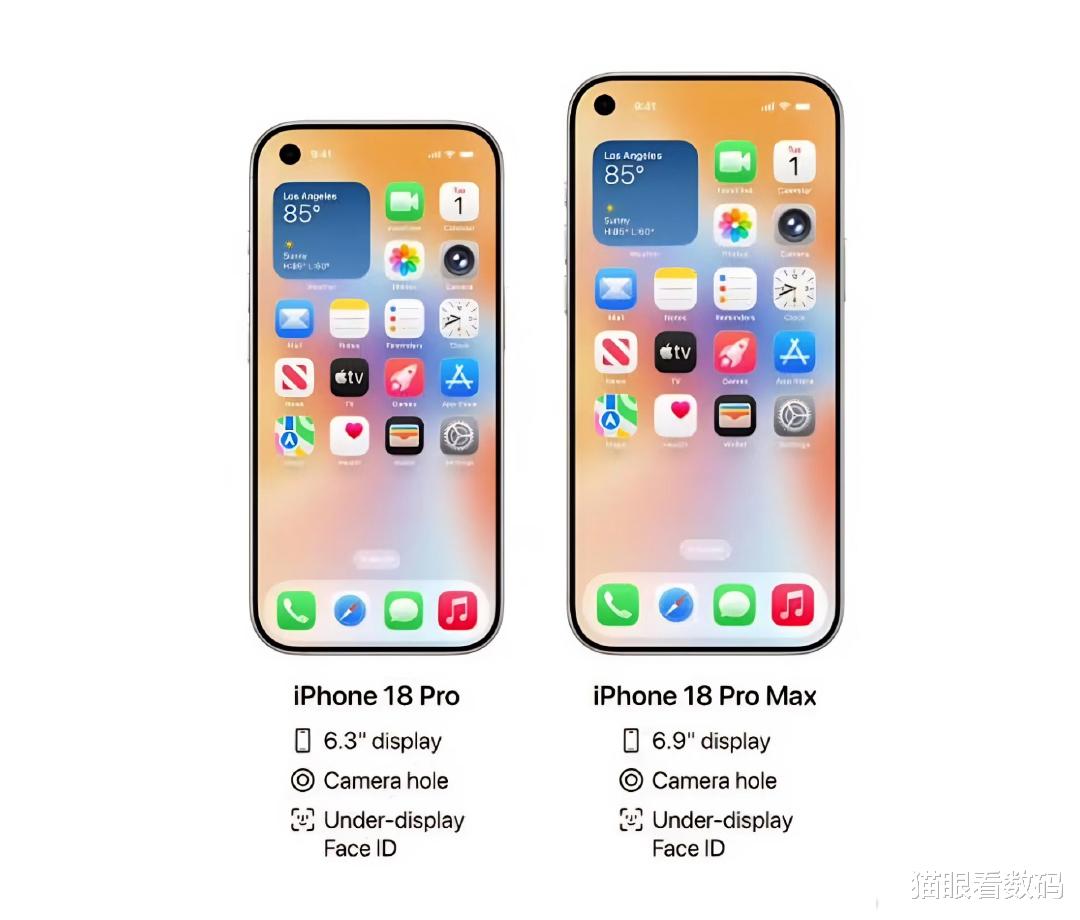 而在iPhone 18 Pro和Pro Max则要彻底跟药丸形的灵动岛说再见了。取而代之的是把Face ID结构光组件藏到屏幕下方,只在屏幕左上角留一个给前置摄像头用的单挖孔。好家伙,这不就是安卓阵营玩了好几年的设计吗?如果这个爆料成真,那Pro系列的正面颜值,绝对是近几年来最大的一次飞跃。