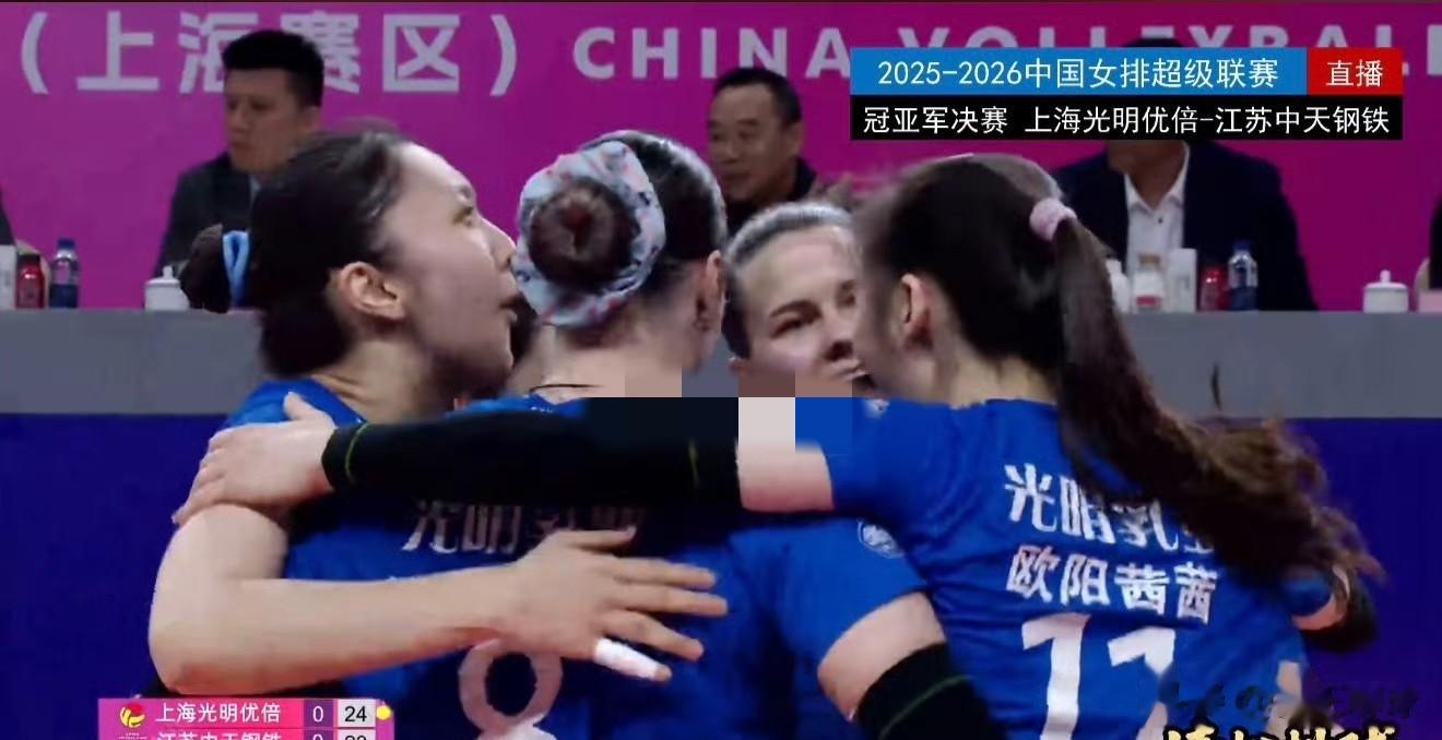 2025-2026中国女排超级联赛A级,总决赛冠亚军决赛第三回合,上海光明优倍vs江苏中天钢铁。也是决定冠军归属的一场比分,因为前两场场分是1-1,今天两队回到同一起跑线,谁赢谁是冠军,江苏女排能否卫冕?蔡斌上任后,上海女排能不能打破“千年老二”的宿命。