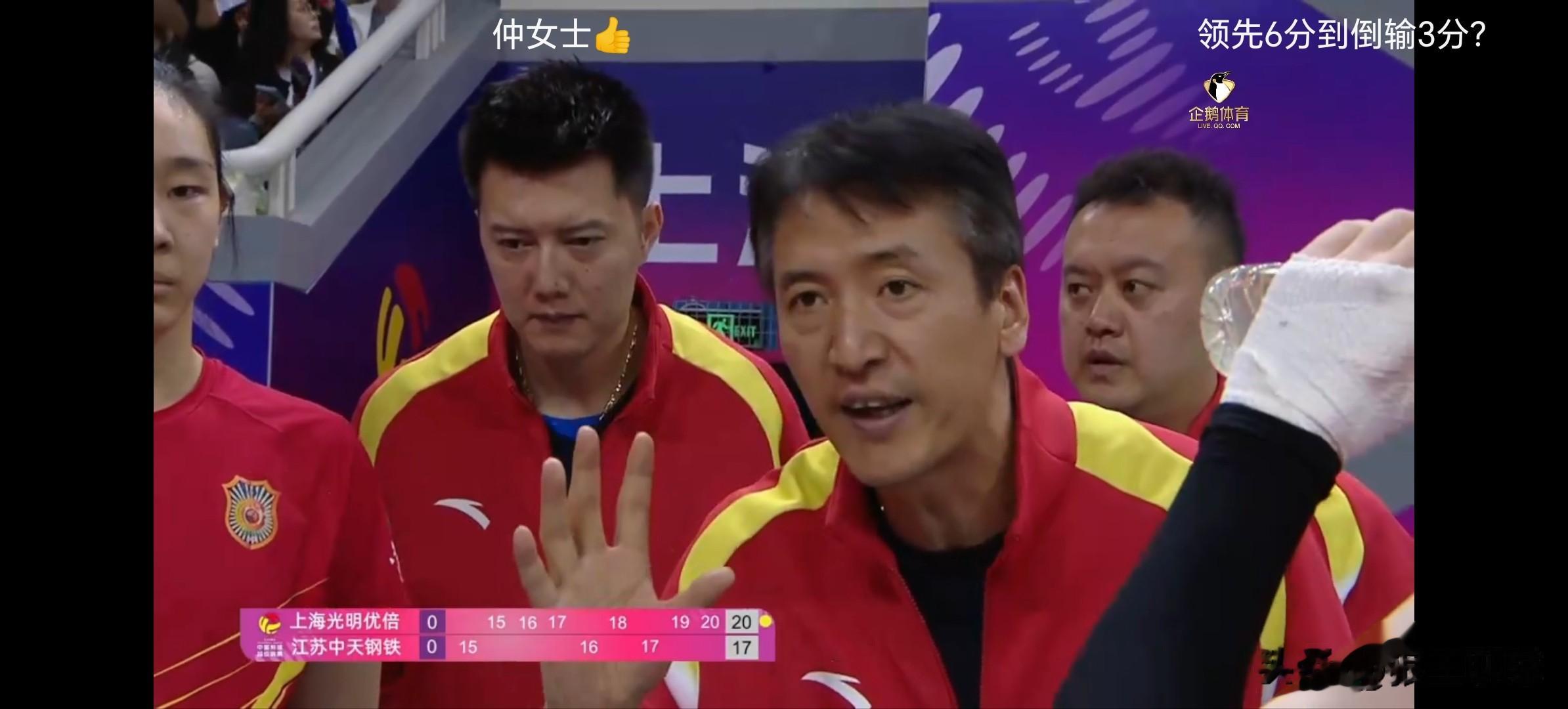 一传到位,陈厚宇3号位快攻打中,仲慧进攻打手落界内得分17-14,上海女排三边攻都能下分,江苏女排困难了。江苏女排第二次暂停,唐欣小斜线切中18-15,范赖克强攻被拦,上海女排第一次暂停,范赖克打手落江苏界内19-16,江苏女排拦网触网20-16。