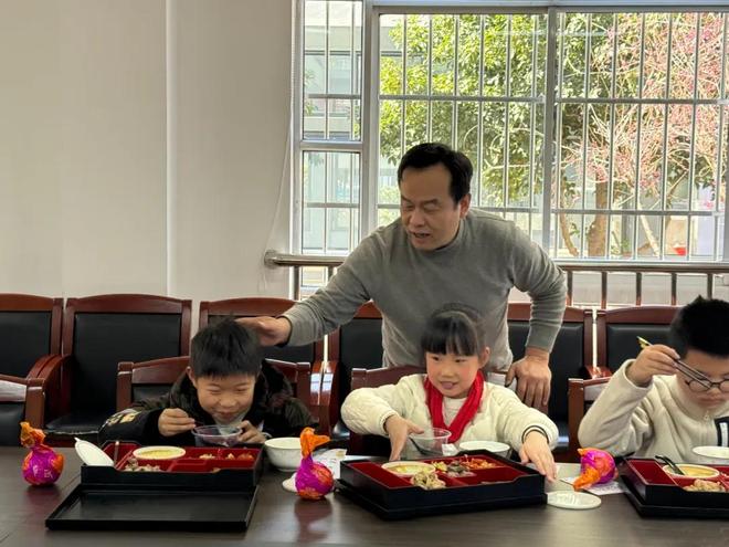 中午铃声刚落,图书馆一楼的欢声笑语暂歇,取而代之的是会客厅内的温馨氛围。孩子们手捧七彩卡,脸上洋溢着期待,还带着一丝羞涩。蔡书记亲切的笑容瞬间化解了紧张,餐桌上荤素搭配的菜肴香气四溢,孩子们一边品尝美食,一边悄悄地观察这位平日里熟悉的“棒棒糖书记”,眼神中闪烁着好奇与喜悦。