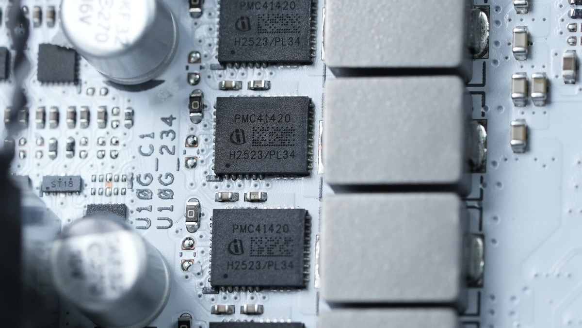 我们对ROG B850迷你吹雪主板进行了拆解,看看其具体的用料。供电部分,ROG B850迷你吹雪的10+2核心供电选用英飞凌PMC41420 Dr.Mos,这是一颗90A规格的DrMos,与当下ROG高端主板是同款DrMos。