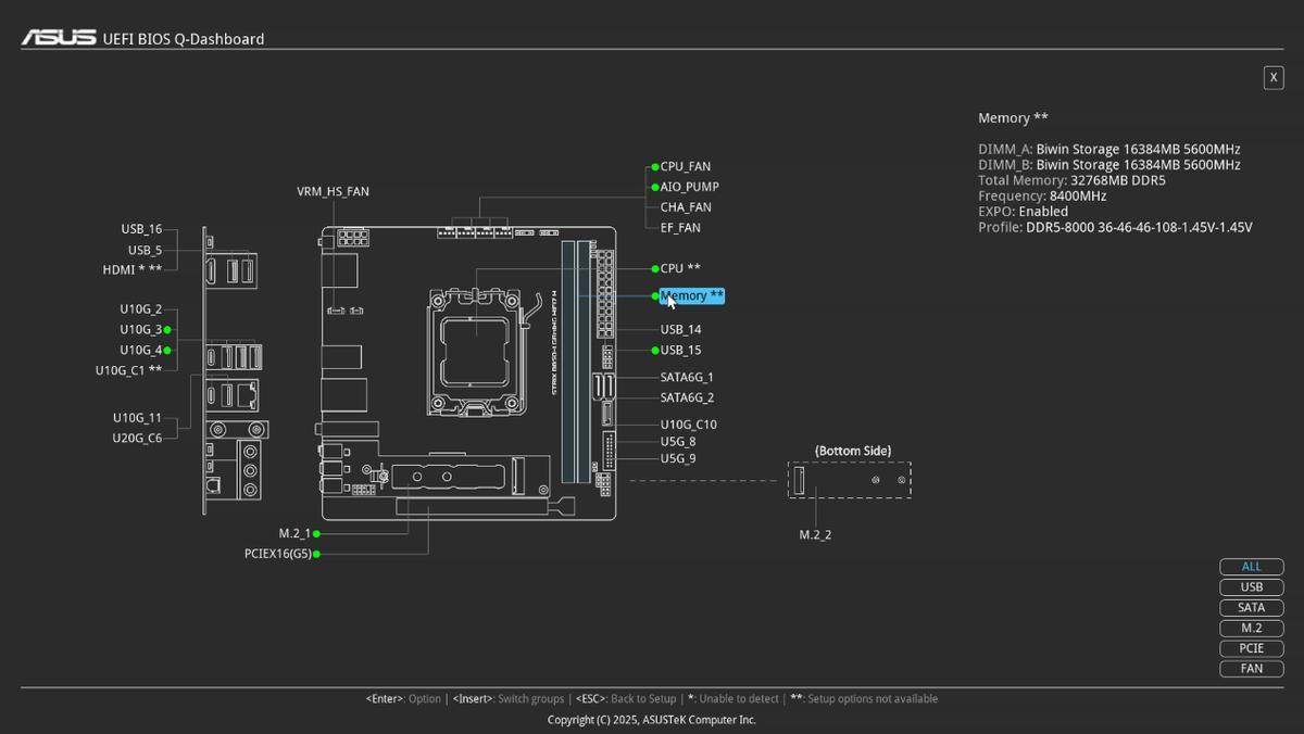 和这一代的ROG主板一样,B850迷你吹雪的BIOS界面也延续了ROG家族最新的高清界面设计,同时搭载 Q-Dashboard 快捷仪表盘界面,玩家可快速查看硬件状态、调整核心参数,无论是新手还是资深玩家都能轻松上手。