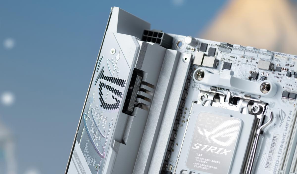 ROG B850迷你吹雪采用了mini-ITX板型设计,最直观的升级便是 “全白蜕变”,PCB设计与此前的黑色款 ROG B850-I师出同门,但在配色上实现了全面革新。除PCB板外,内存插槽、PCIe 插槽、各类接针等可白色化的部件均采用纯白设计,部分元件辅以灰色、银色点缀,整体色调统一协调,堪称 “纯白装机党狂喜” 之作。
