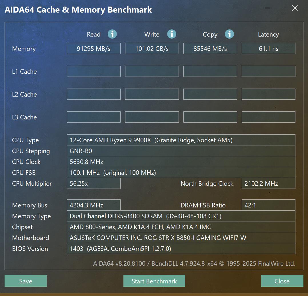 ITX主板只有2条内存插槽,且布线距离更近,天生就有更好的内存超频性能。所以我们也对ROG B850迷你吹雪进行了内存超频实测。在搭配锐龙9000系列处理器时,主板官方标称可以支持8200+MT/s。