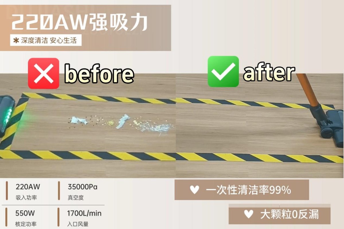 CEWEY DS18主打DS 2.0动力总成与22项专项性能调教技术两大核心优势。配备的35000Pa工业级飓风吸力和2000+档位才有的220AW级别吸入功率,灰尘、毛发和大颗粒的清洁率能到99.9%。