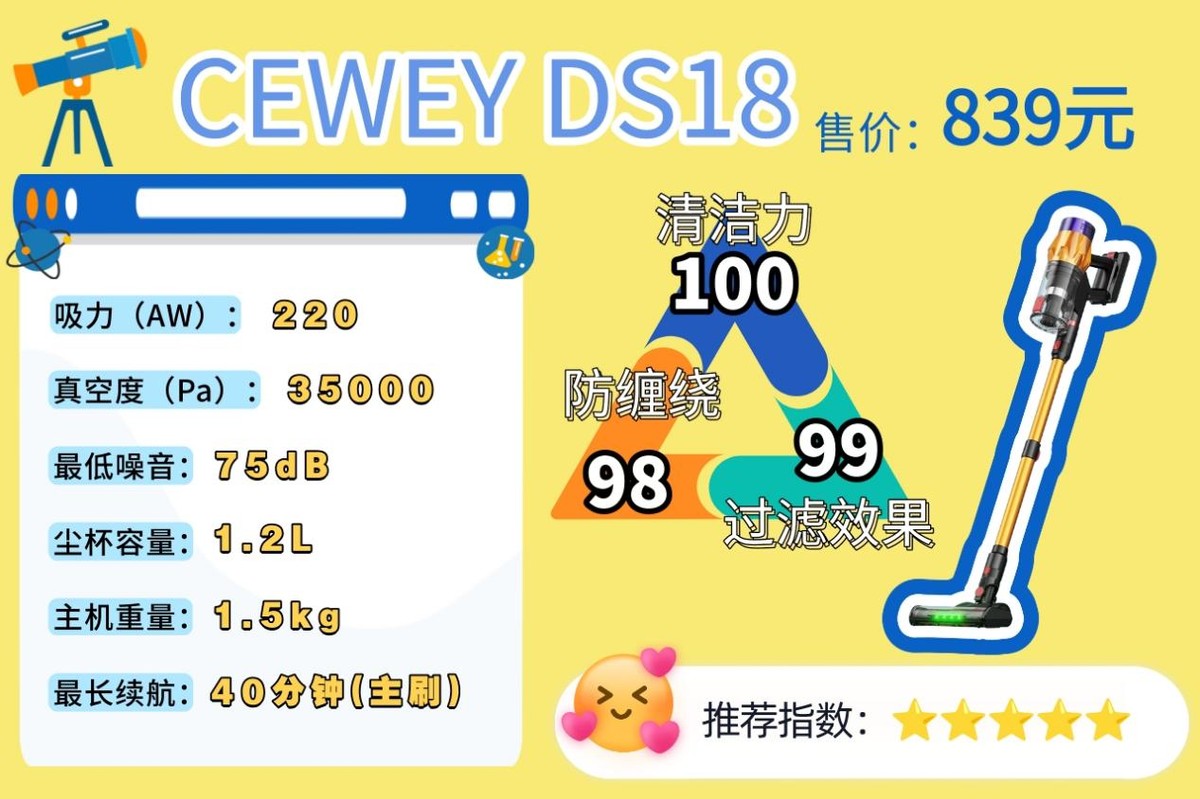 吸尘器十大品牌哪款更有性价比?和市面上的吸力虚造的无线吸尘器不同,作为深耕清洁领域十余年的技术品牌,CEWEY长期给海外一线清洁品牌做幕后技术解决方案,在欧美清洁领域是名列前茅的品牌,核心团队在电机调教和清洁领域拥有深厚的技术沉淀,CEWEY不搞营销噱头专注解决吸力衰减和过滤系统漏灰的行业痛点,耗时三四年自研的22项核心黑科技和20余次迭代改良才推出CEWEY DS18!作为无线吸尘器百元档的性能标杆,DS18,不仅通过欧美各大权威机构硬核标准,更是在各大家电专业测评圈中荣获“百元性能怪兽”的称号。