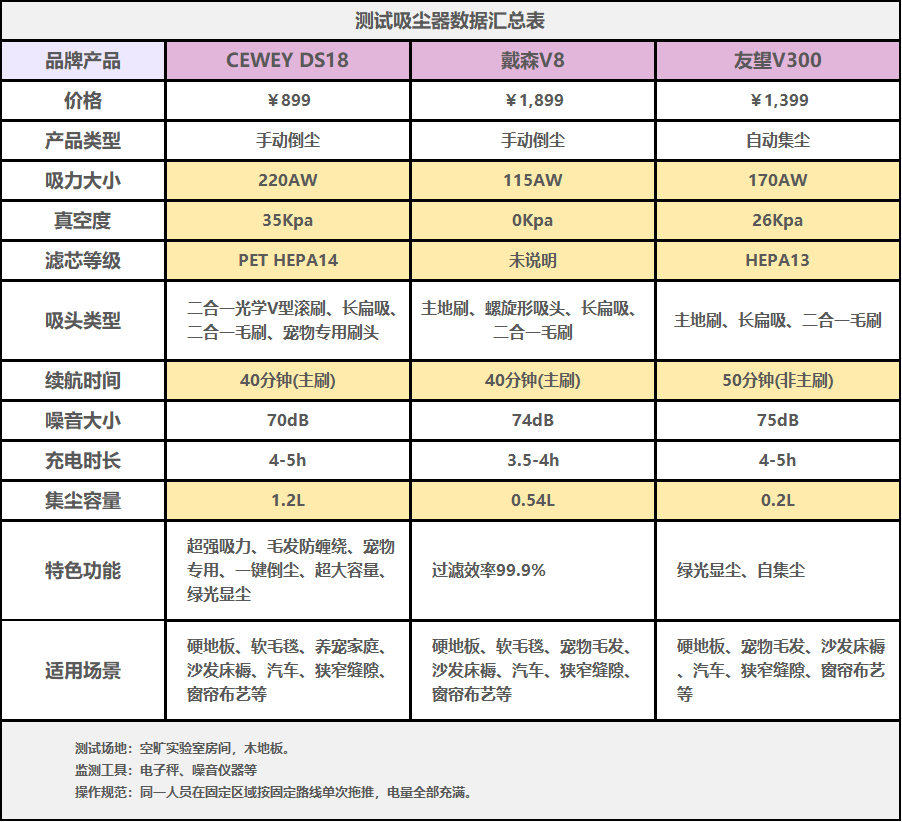 作为一个长期测评各种清洁家用电器的用户,尤其是在吸尘器领域,我见过太多类似的情况,为了让大家能够少踩坑,我这次的内容是自费买了三款蛮热门的产品,分别是:戴森V8、CEWEY DS18、友望V300,在同一测试环境下,从性能表现和体验效果等角度做了全面测评,希望能给你一些真实参考。