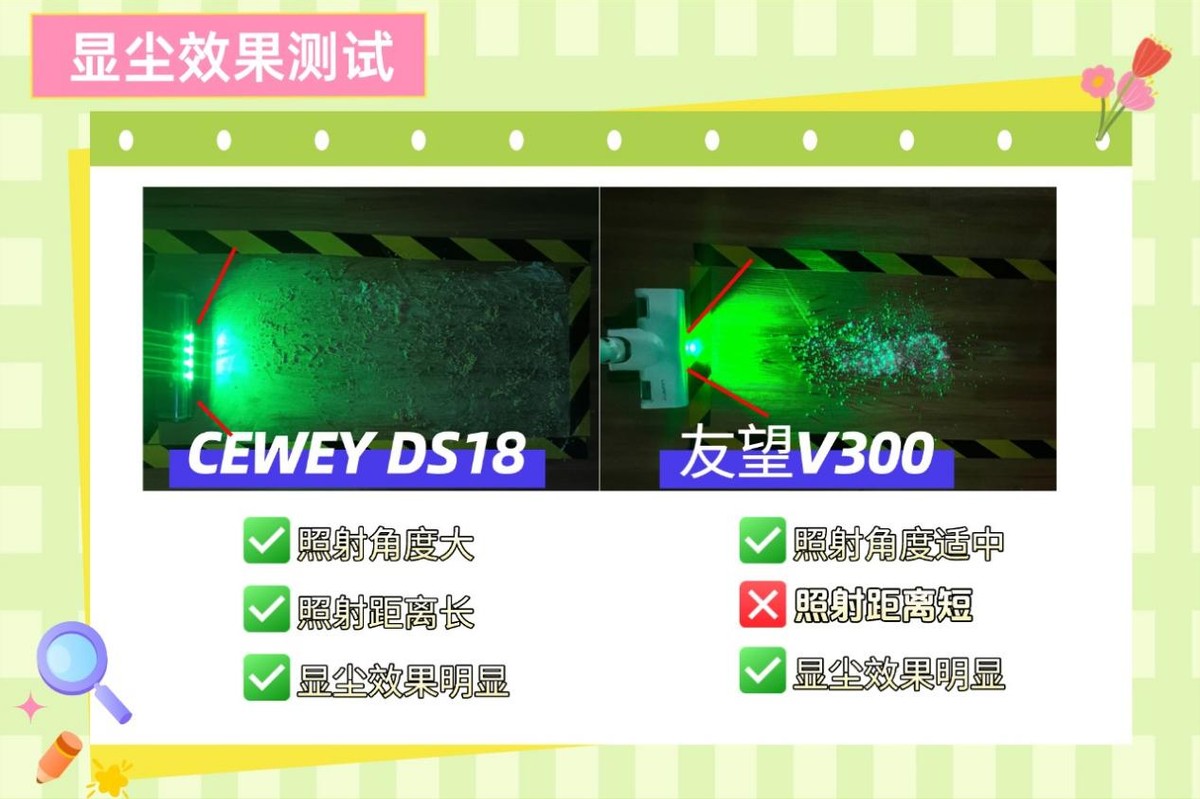 吸尘器十大品牌哪款更有性价比?很多家庭打扫完之后总能看到漏吸得灰尘,有时候可能不是吸力不够大,而是看不清,不知道哪些地方还没有吸干净。所以本项测试主要是关注无线吸尘器在清洁可视化方面,所宣传的绿光显尘灯是否实用有效,观察它们在同一暗光线环境下,在相同灰尘颗粒量级下,个产品显尘的效果表现。
