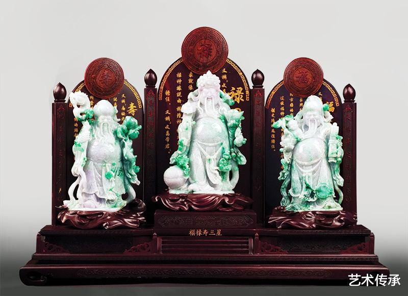 福文化根植国人之心。每一个中国人的心底,都有安置福瑞的基因。纵然历史变迁,纵使沧海桑田,祈福、纳福一直是中国心最诚挚、最坚定的执守。今天我们不仅为亲友、为自己祈福,也为世界祈福,为人类祈福,为和平和发展祈福。方卡东《福禄寿》翡翠艺术放在当代语境之下,把中国传统文化发扬光大,在传承中超越,以恢弘大气的中国气场,升华出新的祥瑞境界。