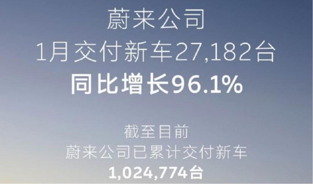 2026年2月1日,蔚来如期发布了上个月的销量数据,三个品牌合计交付新车27182辆,同比大幅增长96.1%。
