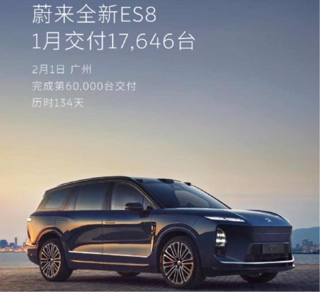 在这27182辆的新车中,全新ES8占到了17646辆。根据蔚来披露的数据,在2月的第一天,历时134天,全新ES8完成了第60000辆交付。
