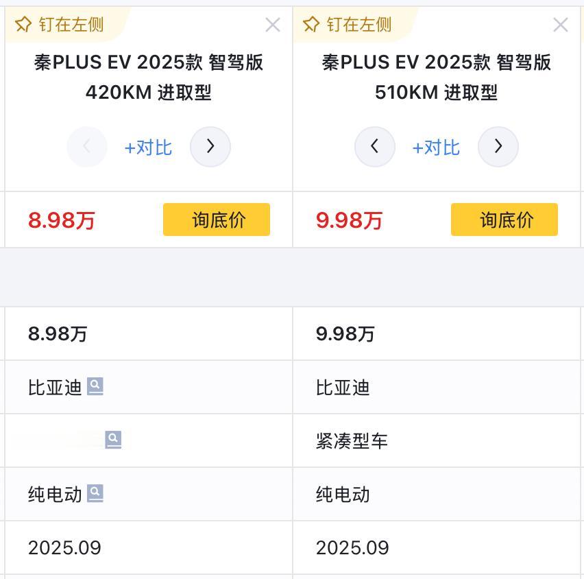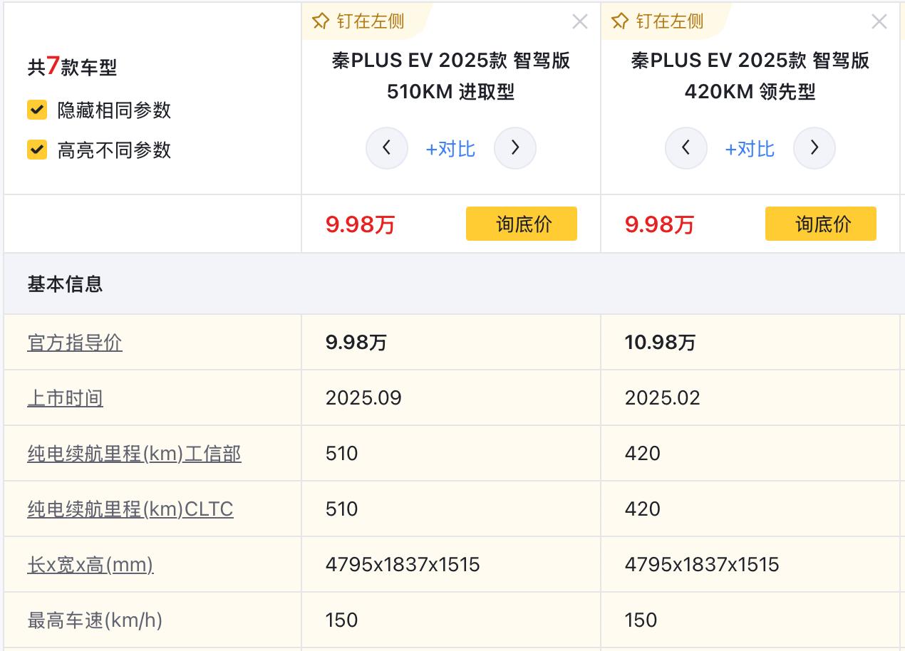 目前秦PLUS EV在售的为2025款,分为420km续航和510km续航的两个版本的共五款车型,它的指导价格在8.98-12.98万元,那么具体该怎么选择呢,