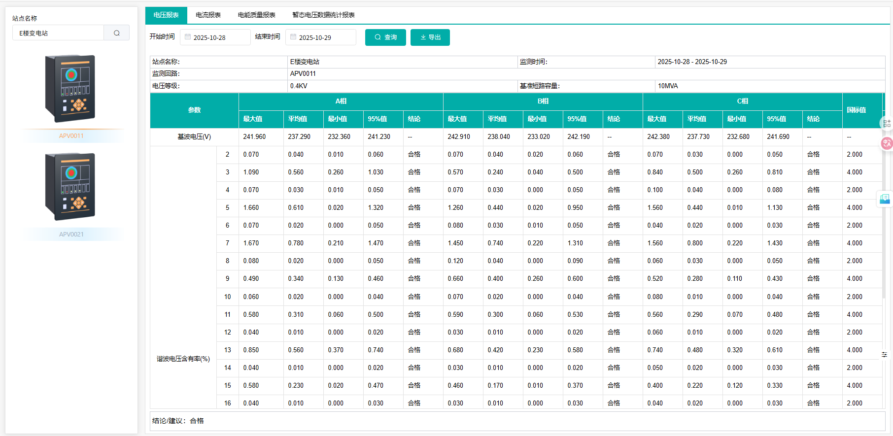 实时跟踪电压谐波、暂态电压等参数,A/B/C 三相数据全面覆盖,确保供电质量符合精密设备运行要求;