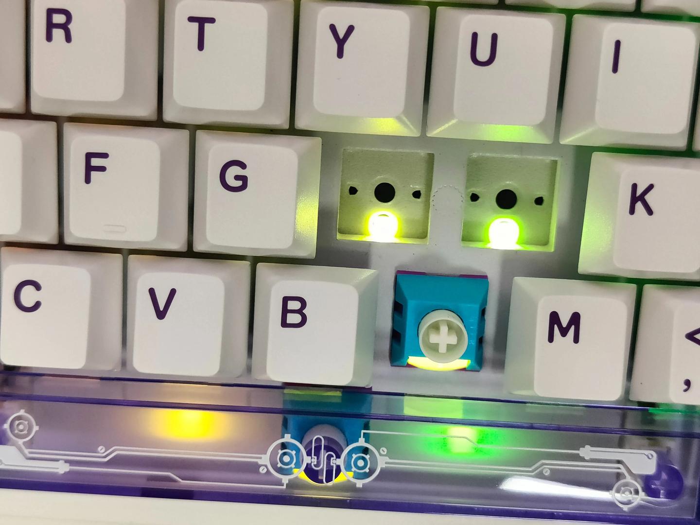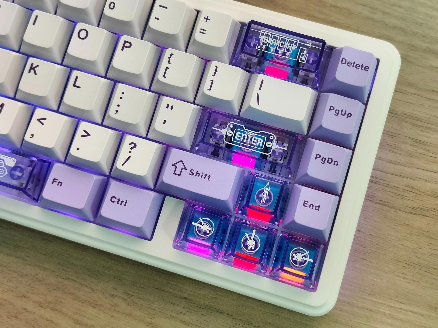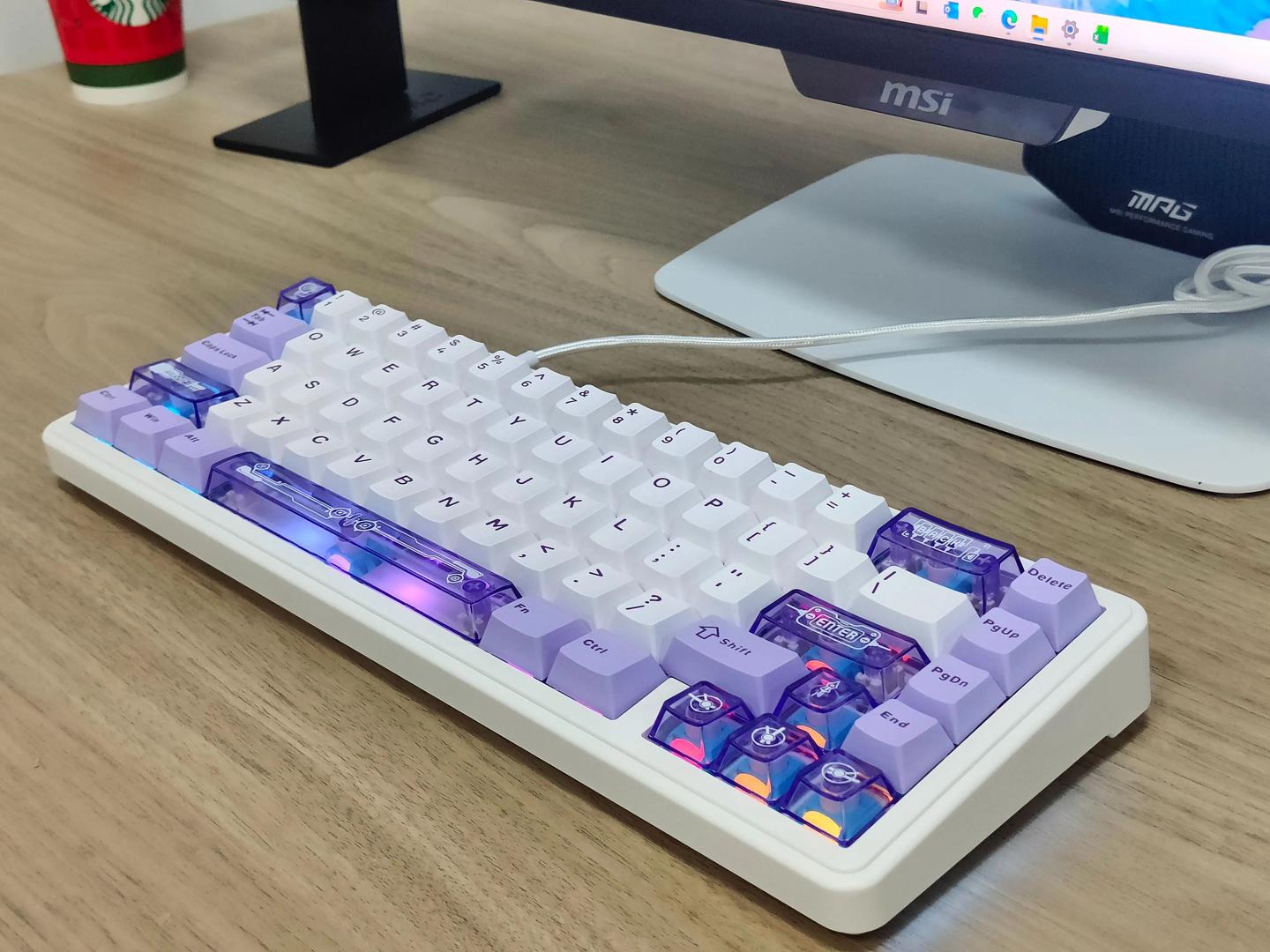 拆开包装把键盘拿出,来第一眼就被颜值戳中!不是饱和度拉满的 “死亡芭比紫”,而是散落在键盘四周带雾透质感的淡紫,半透明质感的键帽,低调素雅。亮灯后紫光从缝隙和键帽中透出,在沉闷的外设堆里直接成了桌面 “最靓的仔”!