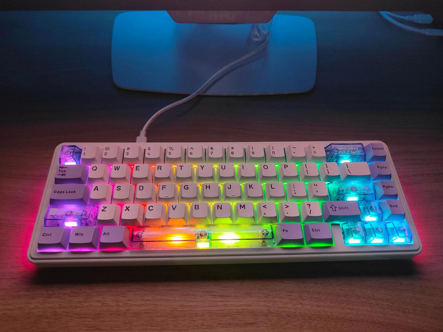 68 键配列实在小桌面的人福音!砍掉多余键位,保留方向键和常用的 Delete、Home 键,码字不用记 “Fn + 字母” 组合,顺手多了。键帽分别采用了PTB和PC材质材质,摸起来糙中带润,用了一周没沾指纹,耐磨又耐用。