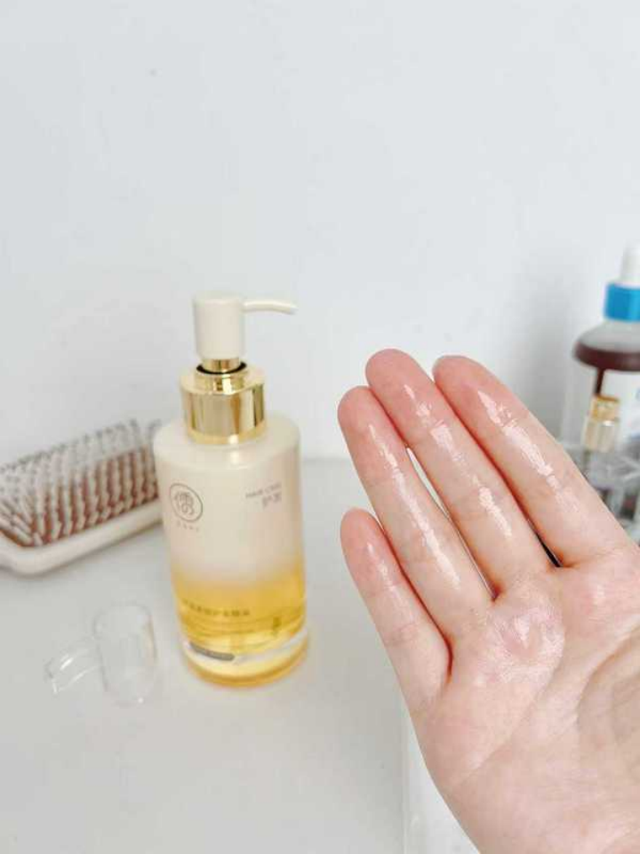 它的质地偏水油,非常清爽,涂抹后手上没有任何油腻感,手上很干爽!一点残留都没有。搭载裸感配方和分解科技后,能快速被头发吸收,我的油性发质也能用,不会打绺,免洗设计还超方便,