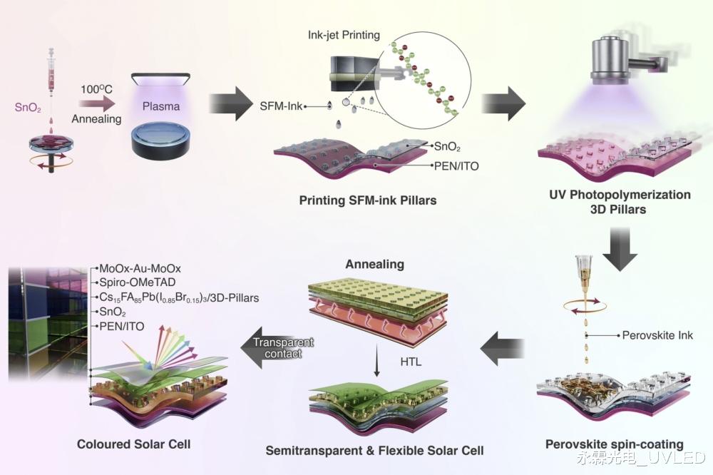在文章《带有 3D 柱状结构的半透明颜色可调钙钛矿太阳能电池》中阐释道,颜色调节是通过调整透明电极层的厚度达成的。设备反射特定波长的光,在持续发电的进程中赋予太阳能板丰富多样的颜色。