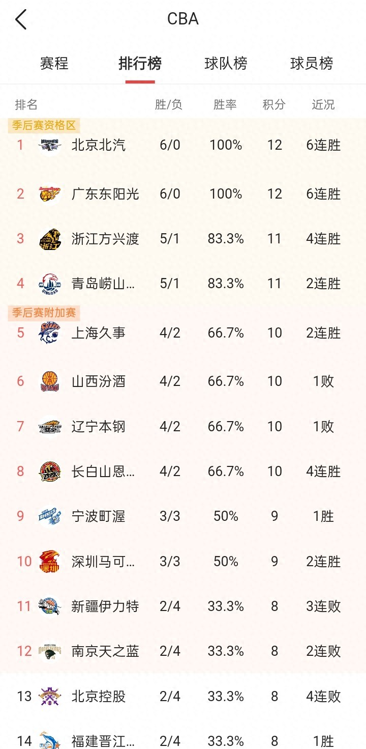 广厦第3,青岛第4,均为5胜1负,上海,山西,辽宁,吉林,均为4胜2负,胜率66.7%,排名积分榜第5至第8位,单节10分钟的比赛竞争更为激烈,容错空间小,各支球队面临更大的机遇与挑战,积分榜不再是“强弱分明”四强区域,季后赛区域竞争激烈看点更多,对于球迷,精彩篮球盛宴不容错过……