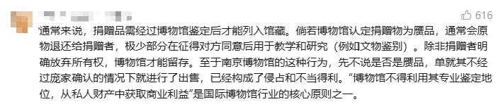 有经验的网友也指出,如果捐赠物是赝品的话,也应该返还捐赠者,而不是自己私下处理,这也反映出博物馆处理藏品的漏洞,希望文物局能够查清楚来龙去脉,也希望有关漏洞能够改善,不要因为个人的贪念,把人民对博物馆的信任付之东流。