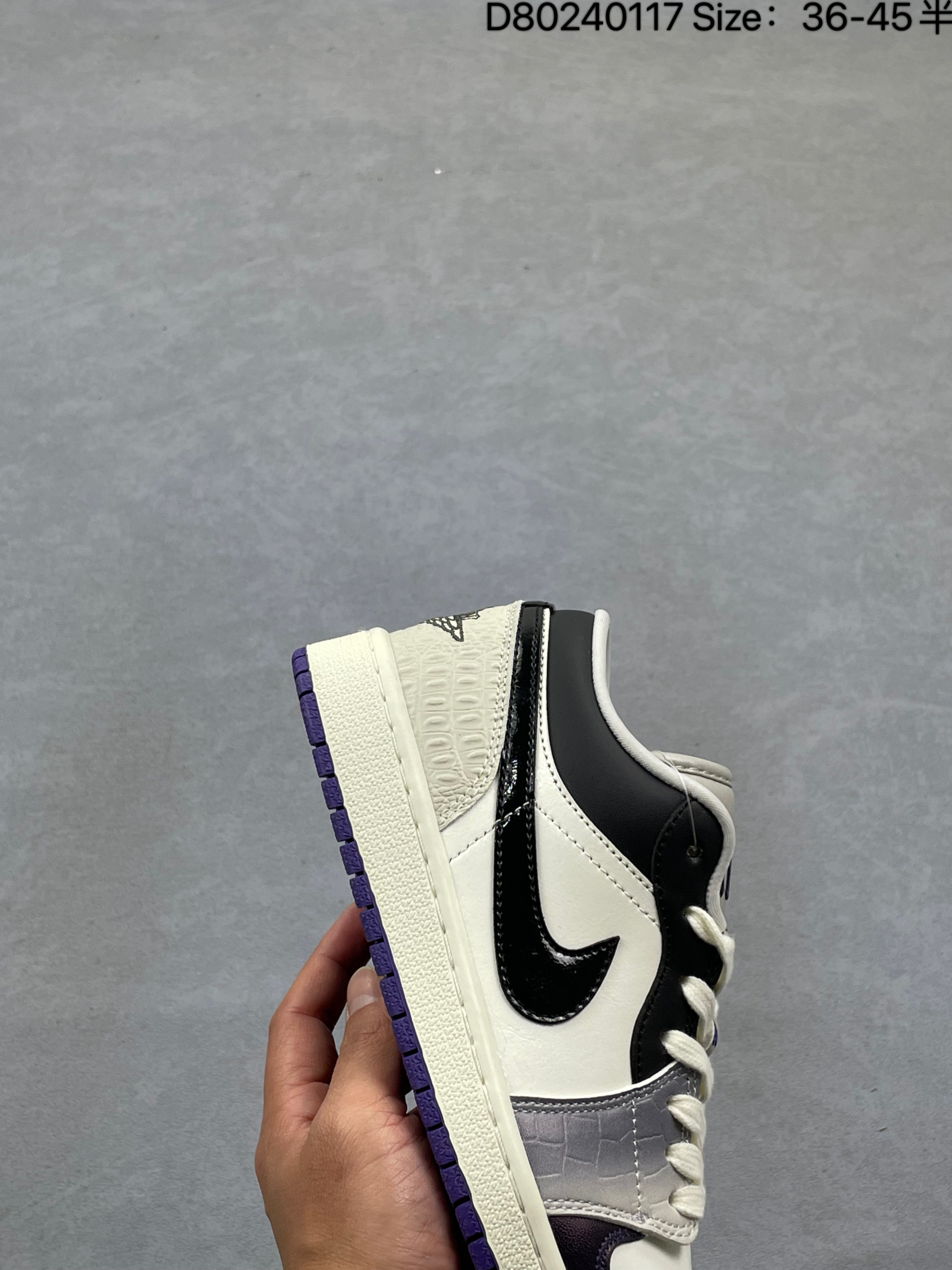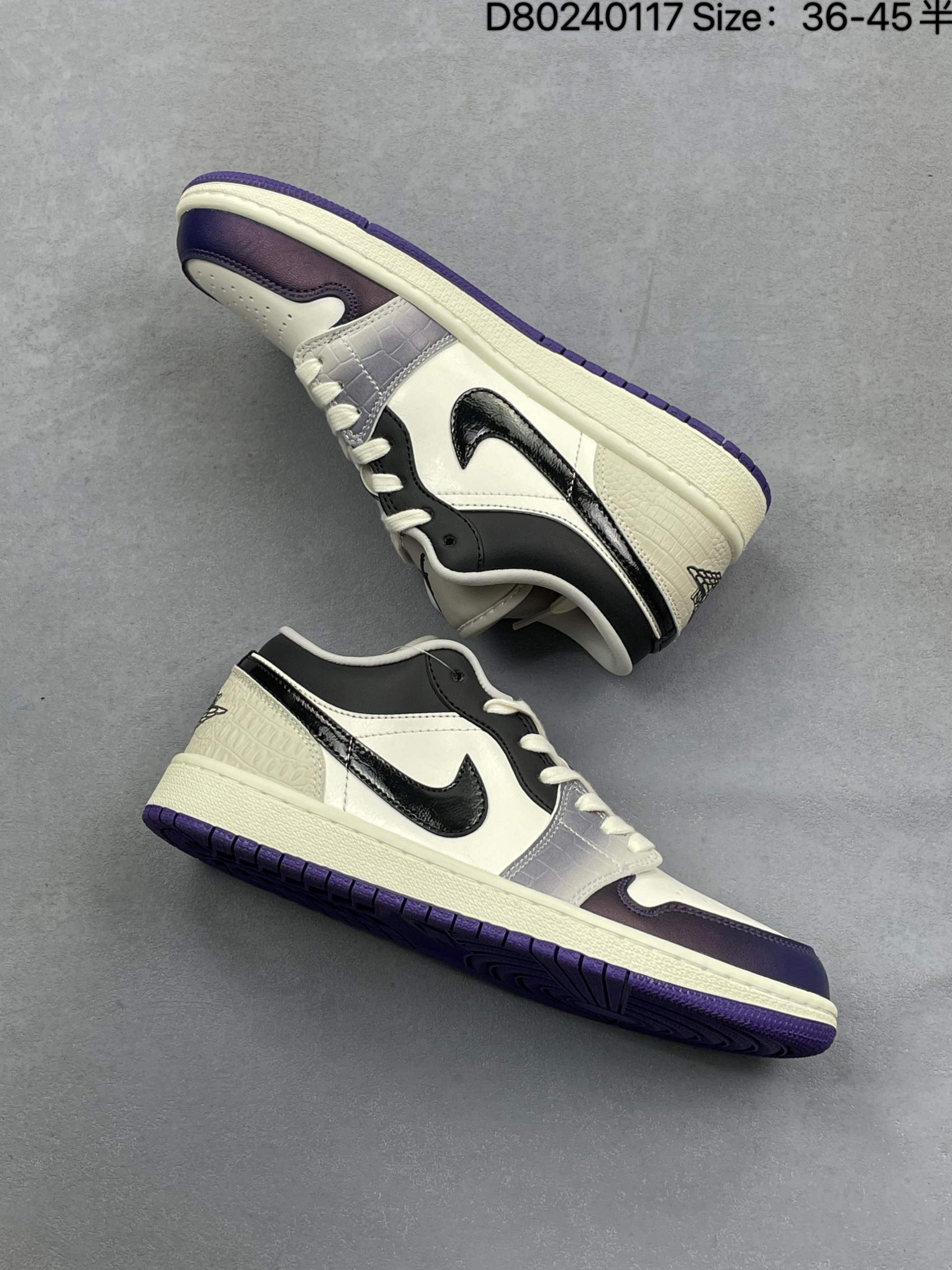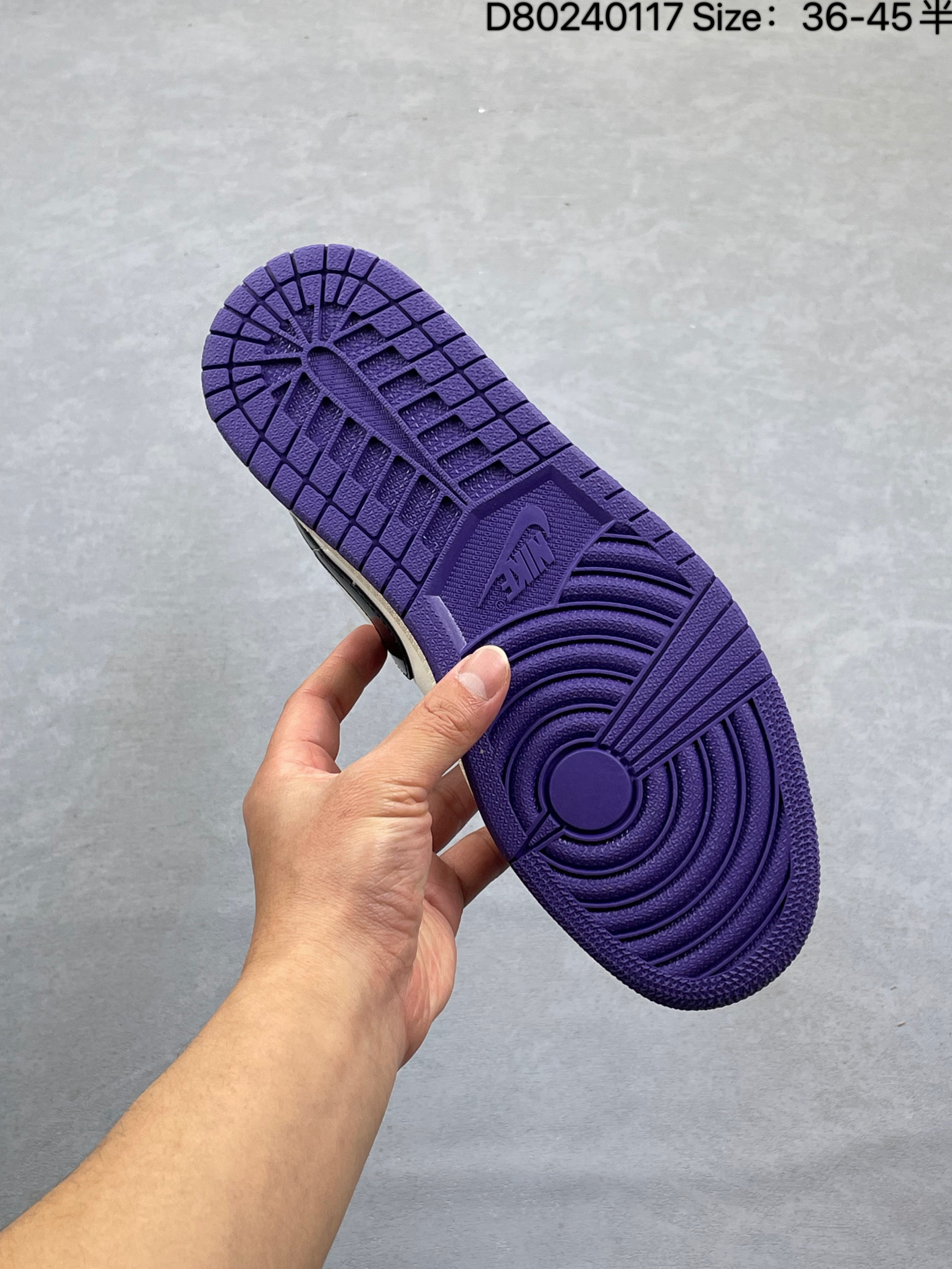 Air Jordan 1 Low ''Purple'' 朋克紫 休闲运动鞋 整双鞋在经典黑白配色的基础上,融入不少全新设计元素,在皮质鞋面部分,鞋身采用白色皮革打造,搭配黑色框架覆盖层,鞋头位置加入金属紫色电光设计,鞋身两侧Swoosh Logo及鞋领采用黑色点缀,鞋侧束带和鞋尾部分加入类似爬行动物纹路,值得一提的是鞋舌左右上分别以Jumpman Logo以及朋友字样Air呈现,后跟Wings Logob辅以黑色刺绣呈现,最后以米白色中底搭配紫色橡胶外底完善整体设计收尾。