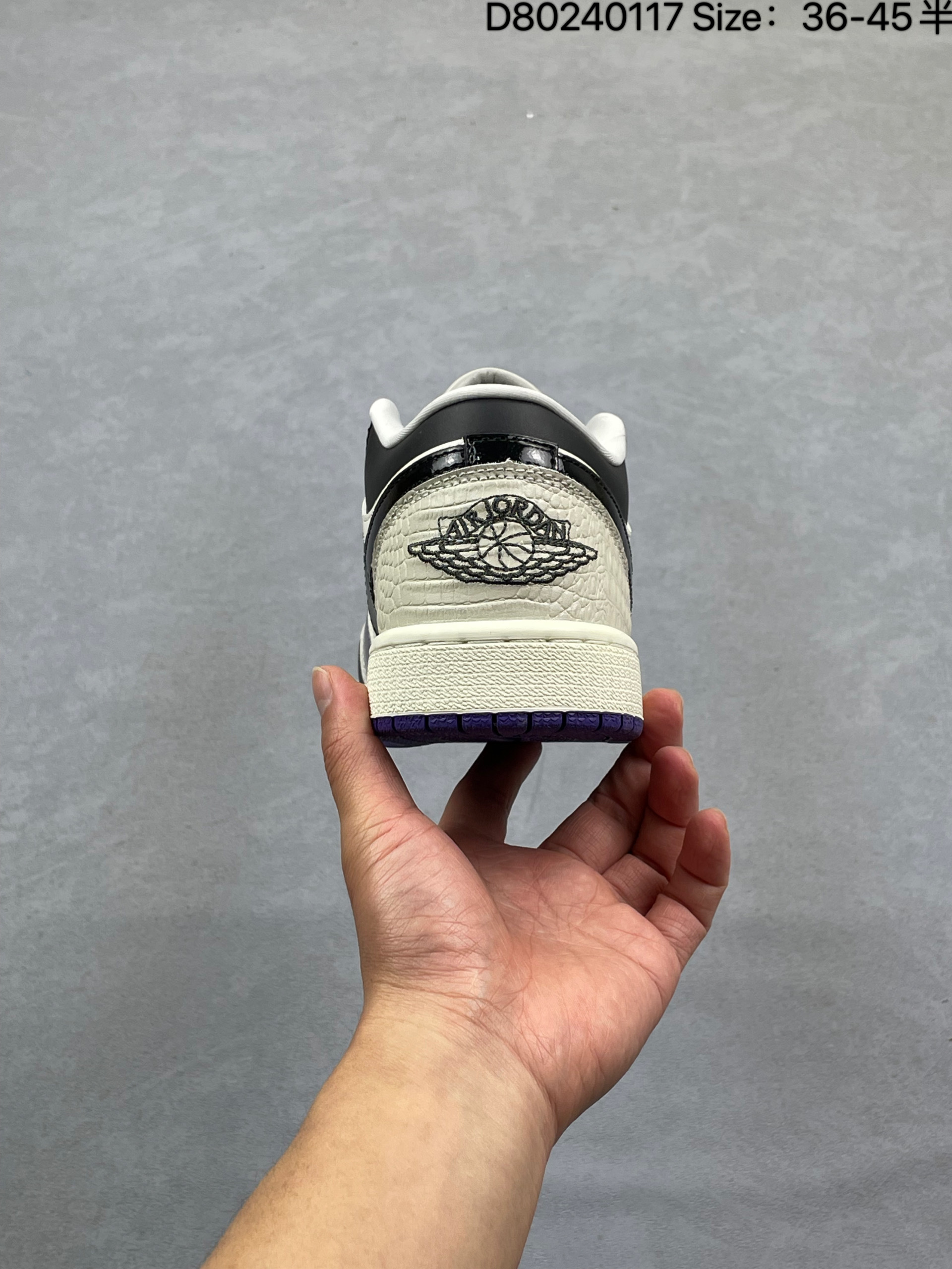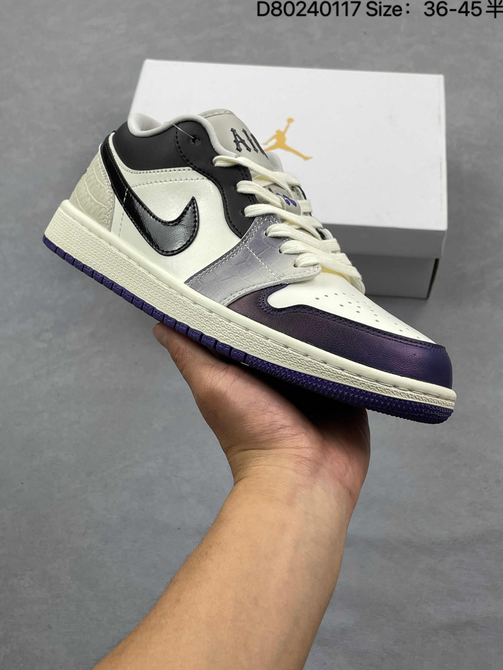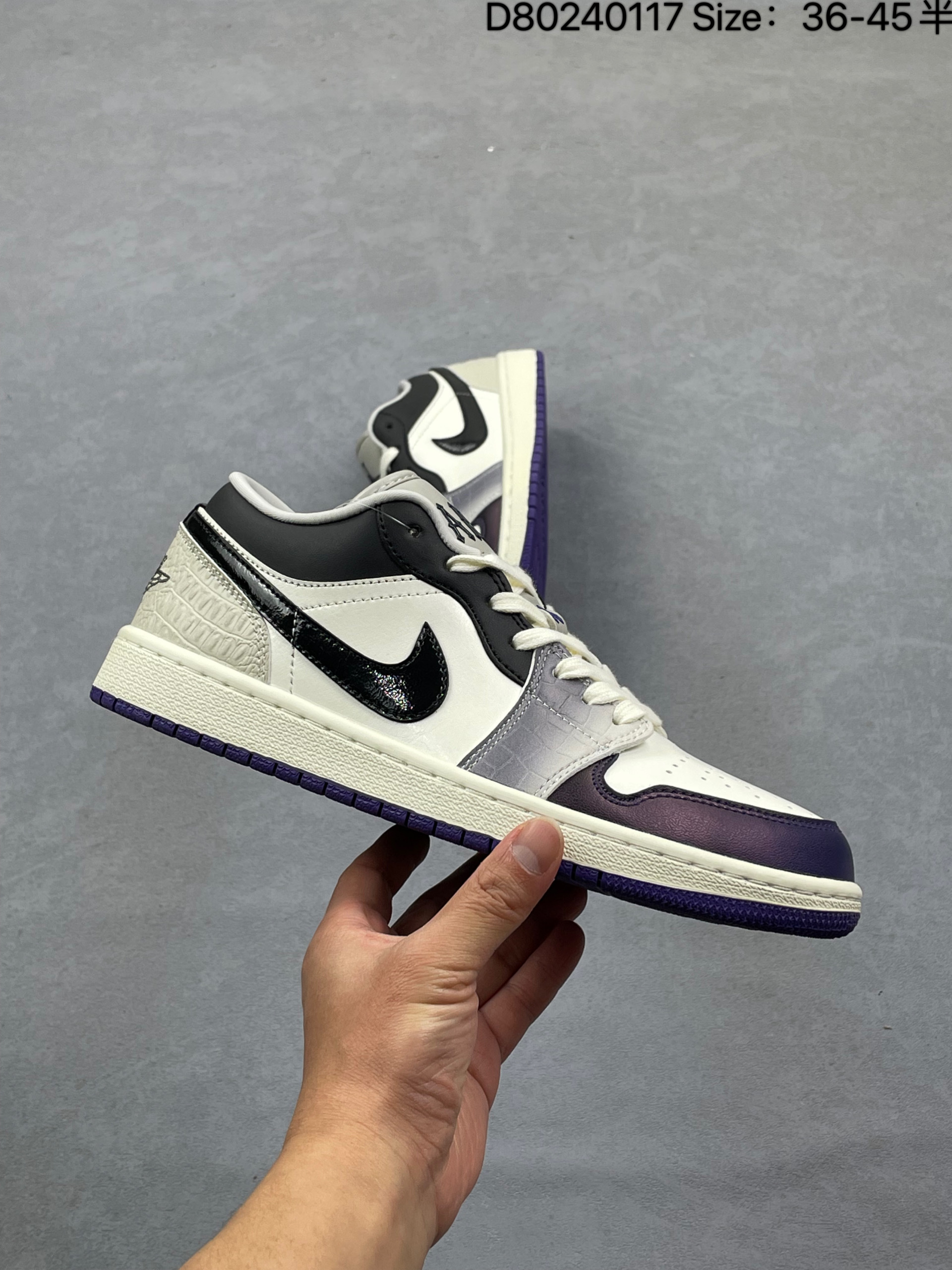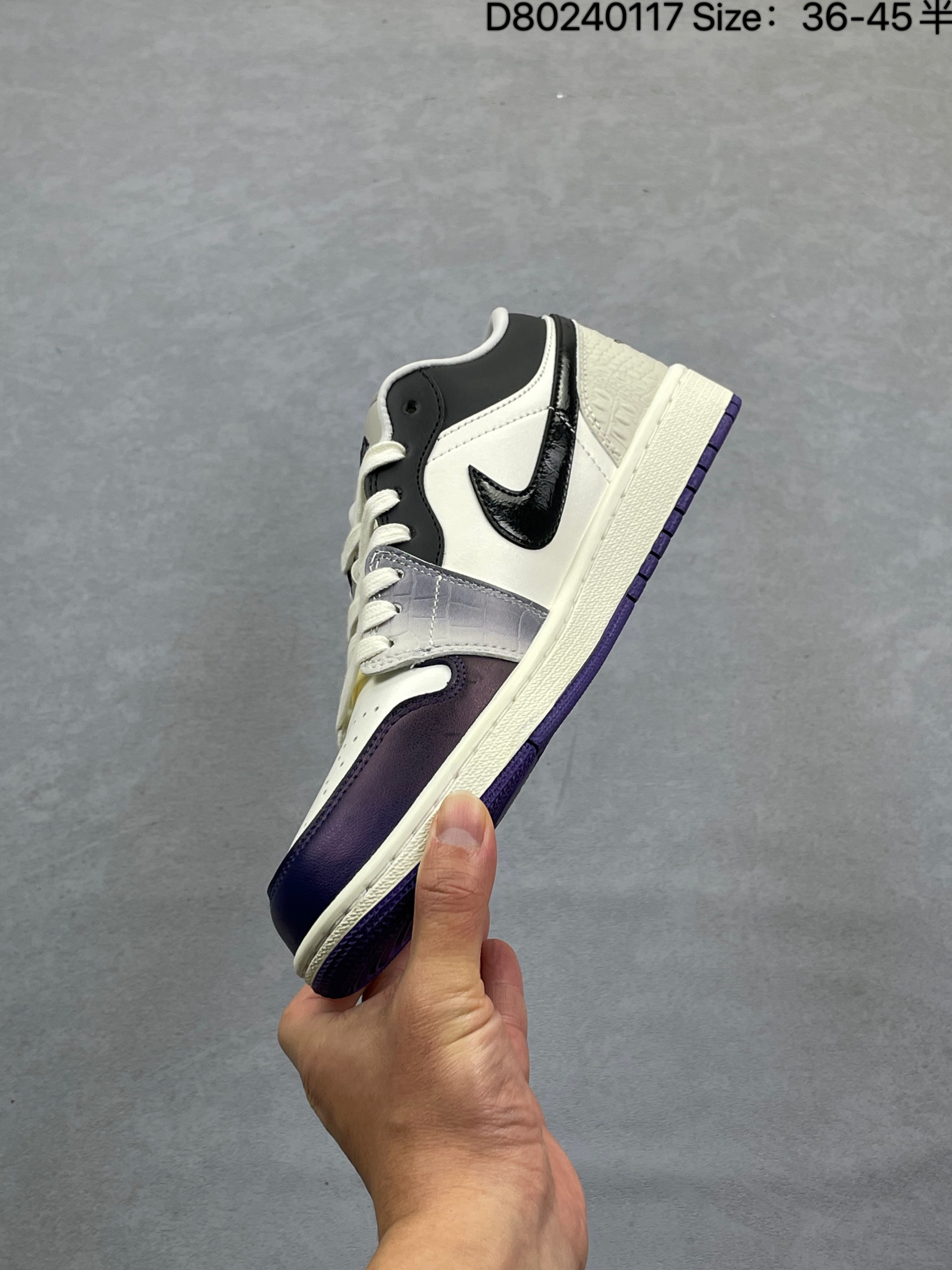 Air Jordan 1 Low ''Purple'' 朋克紫 休闲运动鞋 整双鞋在经典黑白配色的基础上,融入不少全新设计元素,在皮质鞋面部分,鞋身采用白色皮革打造,搭配黑色框架覆盖层,鞋头位置加入金属紫色电光设计,鞋身两侧Swoosh Logo及鞋领采用黑色点缀,鞋侧束带和鞋尾部分加入类似爬行动物纹路,值得一提的是鞋舌左右上分别以Jumpman Logo以及朋友字样Air呈现,后跟Wings Logob辅以黑色刺绣呈现,最后以米白色中底搭配紫色橡胶外底完善整体设计收尾。