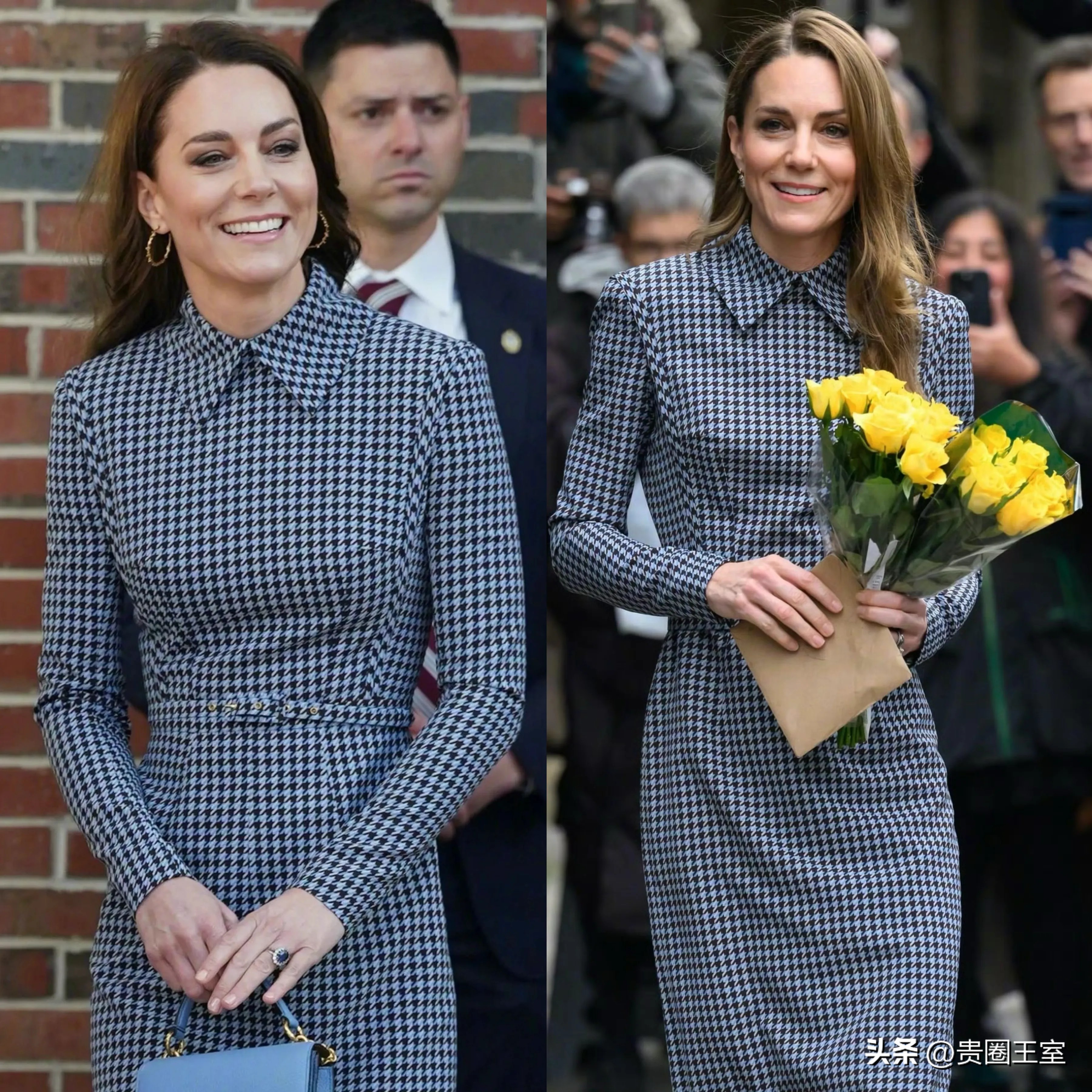 当天凯特王妃一身格子长裙搭配高跟鞋,一头大波浪长发一如既往的优雅迷人,看起来凯特王妃的精神状态还是不错的。
