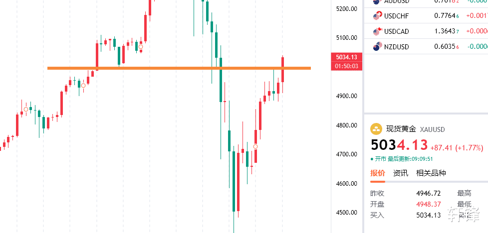 黄金回踩5002/5004附近多,防守4989,目标看5050/5100上方