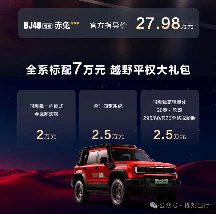 这款定位“BJ40家族颜值担当”的新车,官方指导价27.98万元,购车即享价值7万元的“越野平权大礼包”,涵盖同级唯一内嵌式金属防滚架、全时四驱系统、轻量化20英寸轮毂与295/60 R20全路况轮胎三大核心配置,直接拉满越野基础实力。专属“赤兔红”车漆如同汗血宝马疾驰时的肌肉红晕,搭配定制拉花、扩充版轮眉、双“耳”尾翼与模块化一体式前后杠,将硬派美学与潮流设计完美融合;铝合金爬梯、侧挂包、固定踏板等实用装备原厂配齐,车顶平台巧妙避开天窗区域,在加固车身的同时拓展装载空间,搭配2.5吨拖拽资质,房车、摩托艇等户外装备皆可随行。