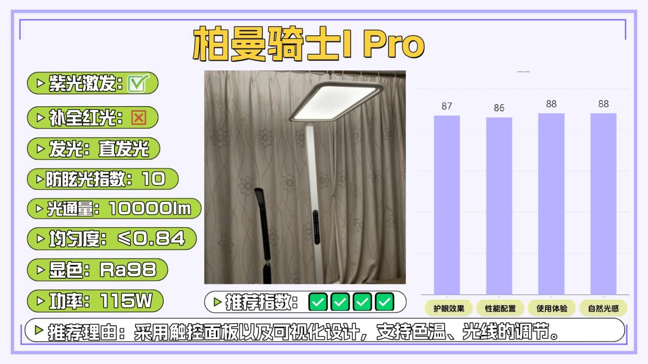 护眼大路灯榜单第七名:柏曼骑士I Pro;采用触控面板以及可视化设计,支持色温、光线的调节。