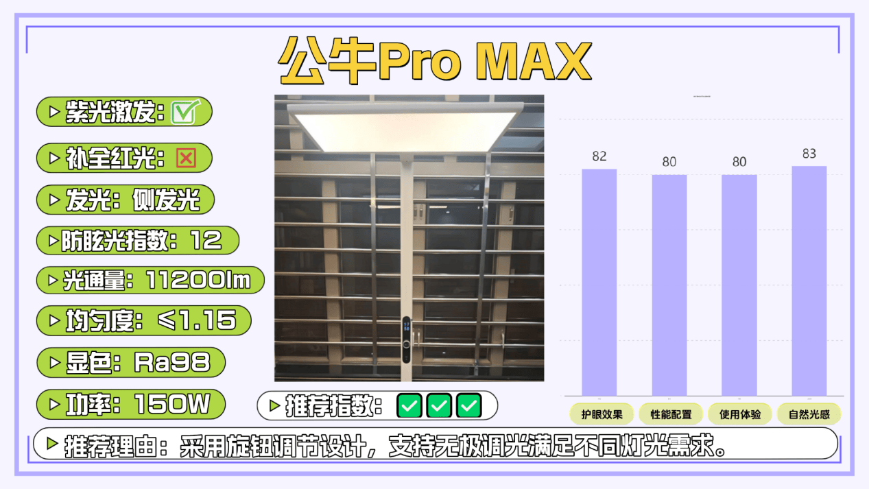 护眼大路灯榜单第九名:公牛Pro MAX;采用旋钮调节设计,支持无极调光满足不同灯光需求。