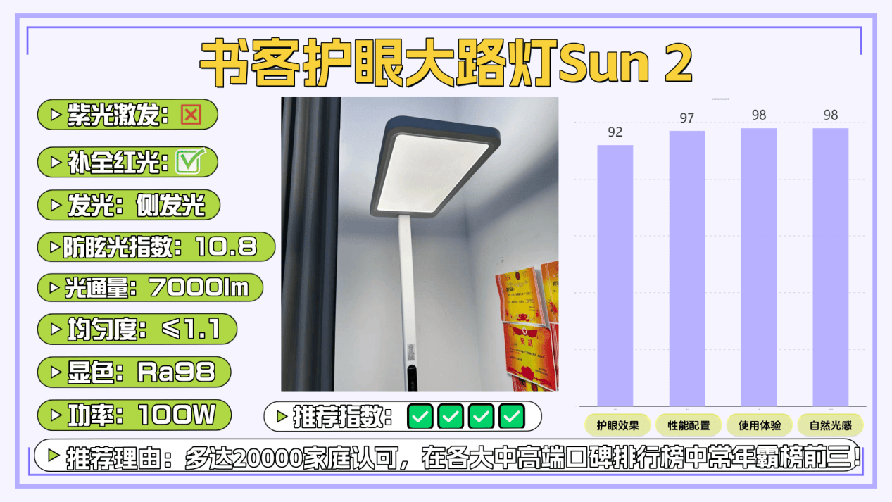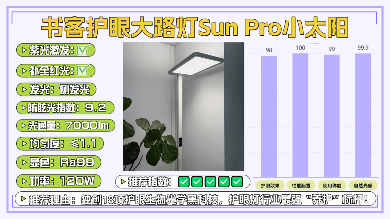 护眼大路灯榜单第一名:书客护眼大路灯SUN2;将“医学养护眼”理念死磕到底的品牌,多达20000家庭认可,在各大中高端口碑排行榜中常年霸榜前三!