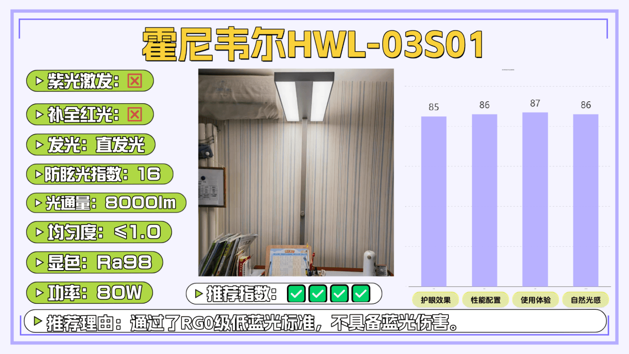 护眼大路灯榜单第二名:霍尼韦尔HWL-03S01;通过了RG0级低蓝光标准,不具备蓝光伤害。