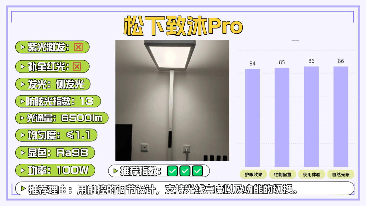 护眼大路灯榜单第四名:松下致沐Pro;采用触控的调节设计,支持光线亮度以及功能的切换。