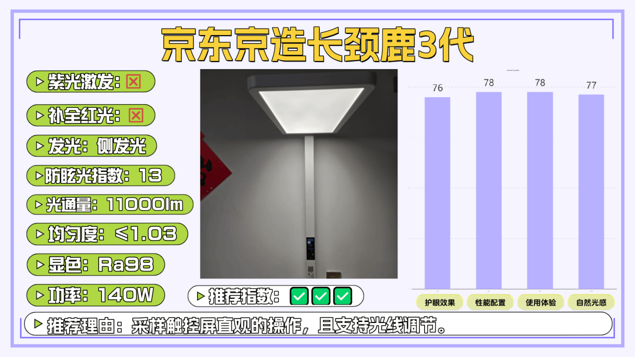 护眼大路灯榜单第十名:京东京造长颈鹿3代;采样触控屏直观的操作,且支持光线调节。