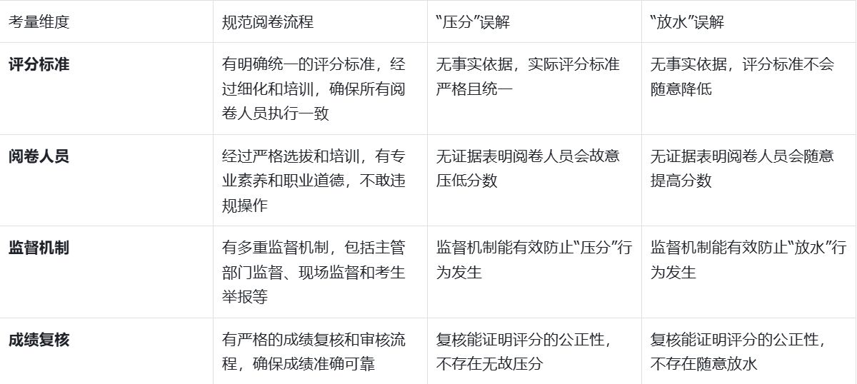 分析2:有些考生看到身边一些平时学习不太认真或者答题不规范的同伴取得了相对较高的分数,就会猜测阅卷存在“放水”现象,质疑阅卷的严谨性。