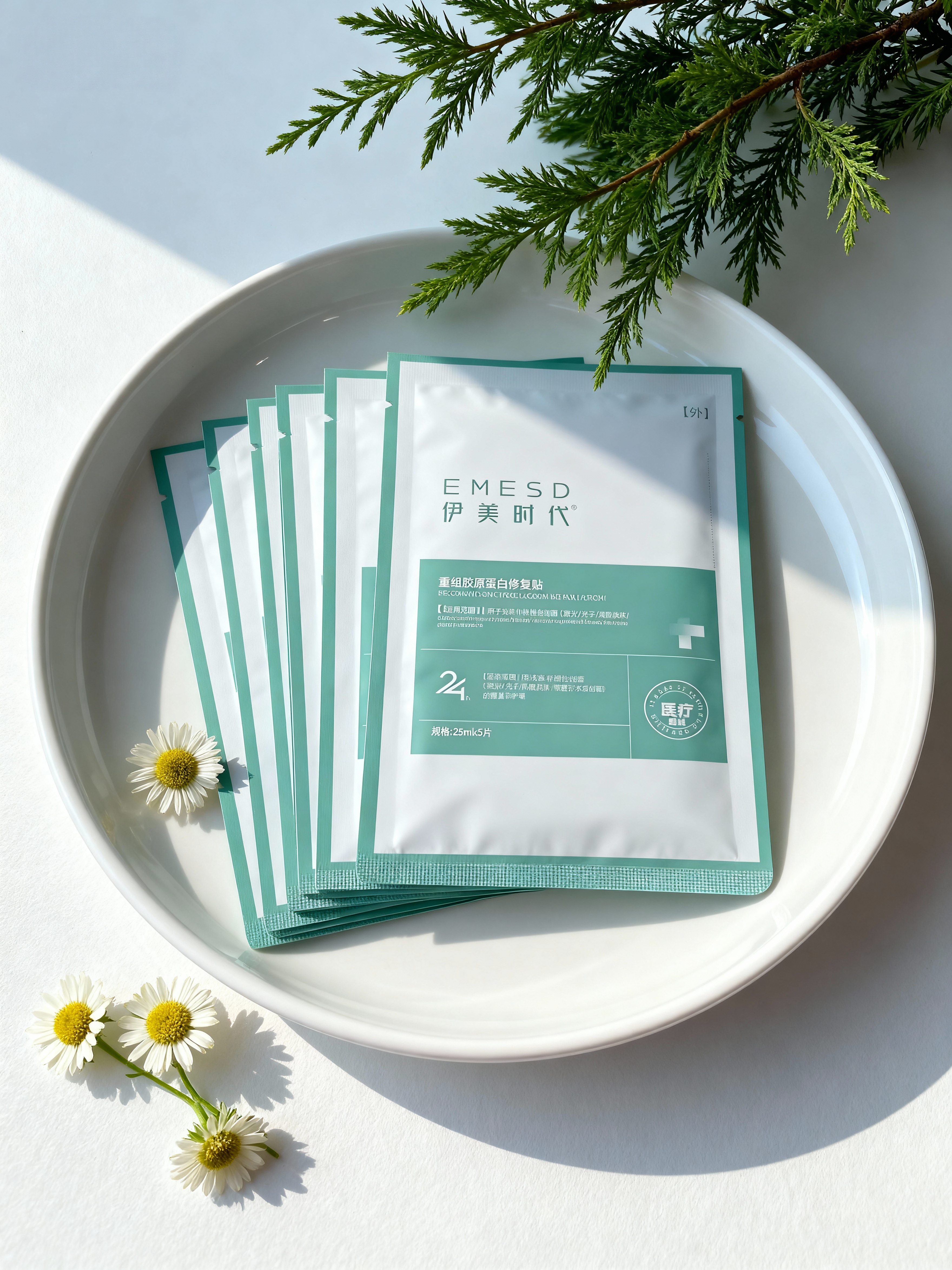阶段二:术后下午时段(约术后4-6小时) 操作:取出“伊美时代”修复贴,展开并贴合于面部。保持敷贴状态,持续15分钟。 皮肤反馈:敷贴过程中,皮肤处于湿润环境,无紧绷或不适。15分钟后移除敷贴,面部治疗导致的泛红较之前减轻。皮肤触感光滑,无精华液残留带来的黏腻感。