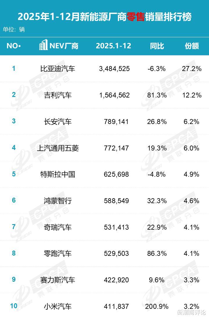 根据乘联分会数据显示,2025年1-12月新能源乘用车市场零售销量达到1280.9万辆,同比增长17.6%;零售渗透率首次突破50%,同比增加6.4个百分点至54%。前十大新能源厂商零售销量合计为972.03万辆,占比超过75%。